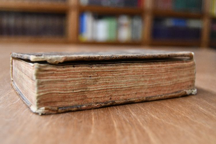 Format 14 x 9 cm, Leder mit 5 Bünden, einem Rückenschild, Rückenvergoldung und umlaufendem Rotschnitt
