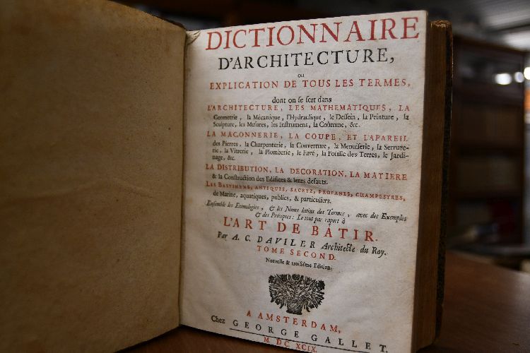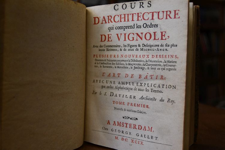 Cours d`Architectur qui comprend les Ordres de Vignole, avec les Commentaires, les Figurs & Descriptions de ses plus beaux Batimens, & de ceux de Michel-Ange. Plusieurs nouveau Desseins, Ornemens & Préseptes concernant la Distribution, la Décoration, la Matieres & la Constructions des Edifices, la Maconnerie, La charpenterie, la Couverture, la Serrurie, la Menuiserie, le Jardinage, & tout ce qui regarde l`Art de Batir, avec une ample Explication par ordre Alphabetique de tous les Termes. Tome Premier + Tome Seconde Dictionnaire d`architecture, ou explication de tous les termes, dont on se sert dans l`architecture, les Mathematiques, la Geometrie, la Mecanique, l`Hydraulique, le Dessein, la Peinture, la Sculpture, les Mesures, les Instruments, la Coutume, etc. La Maconnerie, La Coupe, et l`Apareil des Pierres, la Chapenterie, la Couverture, la Menuiserie, la Serrurerie, la Vitrerie, la Plomberie, le Pave, la Fouille des Terres, le Jardinage, etc. La Distribution, la Decoration, la Matiere & la Construction des Edifices & leurs defauts. Les Bastimens, antiques, sacrez, profanes, champestres, de Marine, aquatiques, publics, & particuliers. Ensemble les Etimologies, & les Noms latins des Termes, avec des Exemples & des Preceptes Le tout par raport a l`Art de Batir..
