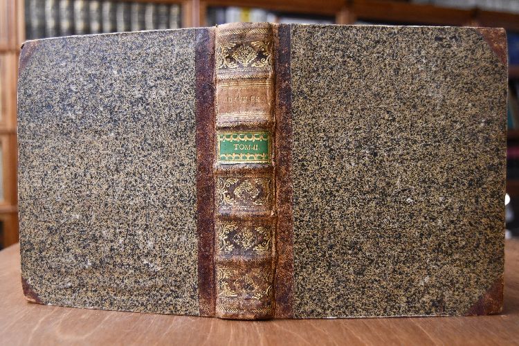 Format 19 x 16 cm, Halbleder der Zeit auf 5 Bünden, mit 2 Rückenschilden und -vergoldung.