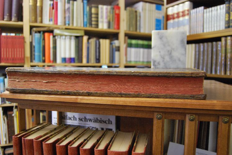 Format 45 x 30 cm, Leder der Zeit mit goldgeprägten Fileten, Eckfleurons, Rückenvergoldung und Rückenschild (Oberes Kapital mit Ausriss, erneuert, unteres Kapital mit kleinem Ausriss und Einrissen in den Gelenken, mit Ldr. unterlegt, Ecken erneuert, mit Kratz- u. Schabspuren).