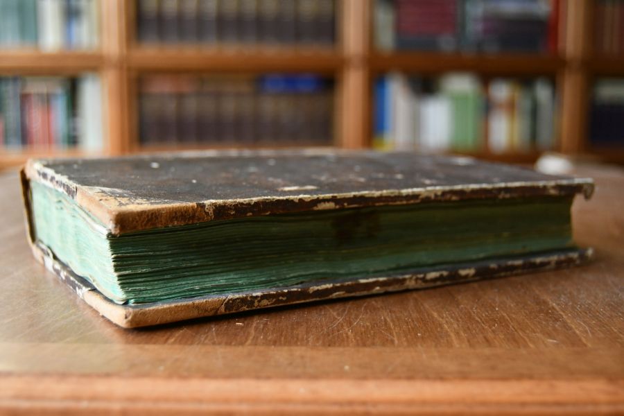 Format 21 x 14 cm, Halbleder mit umlaufendem Farbschnitt. Ursprünglich wohl größeres Format und dann oben abgeschnitten.