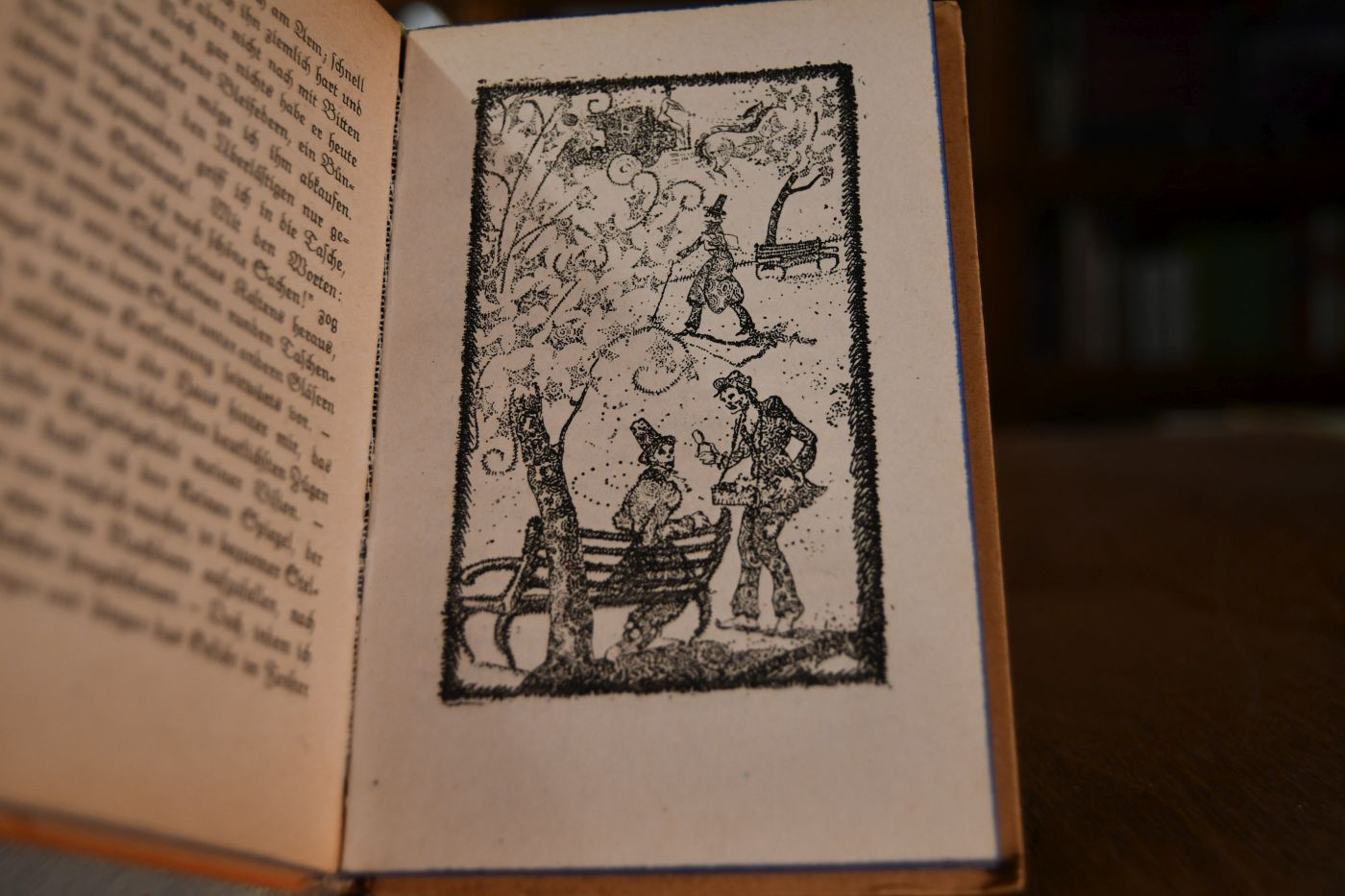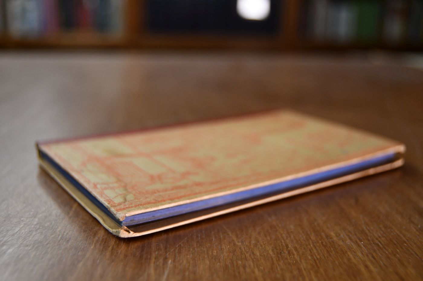 Format 15 x 9 cm, Pappband mit umlaufendem Farbschnitt. Rücken mit Textilklebeband verstärkt.