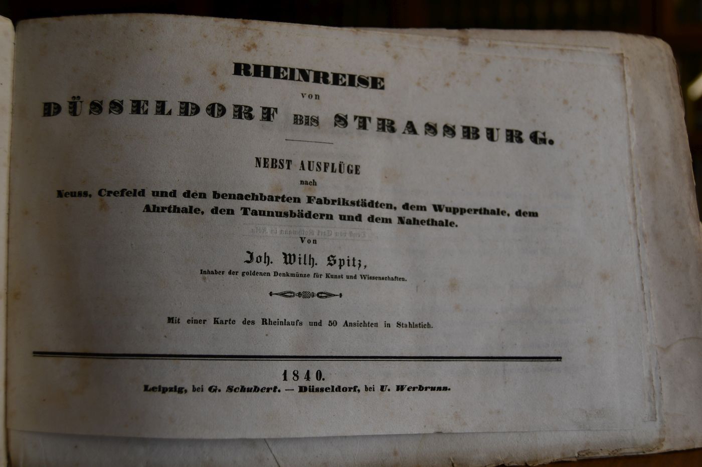 Beschreibung Einband berieben, bestoßen, angeschmutzt und mit Einrissen. Handschriftlicher Besitzereintrag (Marie Lerch) auf Innendeckel. Die Stahlstiche meist mit angeschmutzt, feuchtigkeitsrandig, fleckig und mit Randeinrissen. Die Textseiten teilweise fleckig, feuchtigkeitsrandig und mit Aufschneidespuren. Vorhandene Stahlstiche: 1. Düsseldorf von der Süd-West Seite, 2. Köln, 3. Andernach, 4. Neu-Rheineck, 5. Die Moselbrücke bei Coblenz, 6. Braubach und die Marksburg, 7. Stolzenfels, Lahneck und Oberlahnstein, 8. Stolzenfels, 9. Bacharach, 10. Liebenstein, Sternfels und Kloster Bernhofen, 11. St. Goar und Ruinen der Bergfestung Rheinfels, 12. Ruinen von Falkenberg, 13. Burg Rheinstein, 14. Thal von Engelhölle und Ruinen von Schönberg, 15. Bingen, 16. Rüdesheim, 17. Johannisberg, 18. Der Brandhof, 19. Mainz, 20. Der Marktplatz zu Düsseldorf, 21. Das Rathingerthor zu Düsseldorf, 22. Neuss, 23. Elberfeld, 24. Barmen, 25. Schloss Eltz. Auf Rückdeckelinnenseite aufkaschiert; Der Rheinfall bei Schaffhausen. Von grosser Seltenheit. Im KVK läßt sich kein Exemplar an einer deutschsprachigen Bibliothek nachweisen. Bei Reiss wurde1993 ein Exemplar mit 28 Stahlstichen und einer Rheinlaufkarte versteigert.