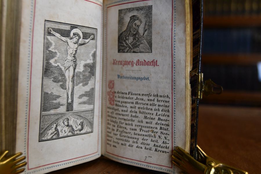 Beschreibung Einband berieben und bestoßen. Vorderer Falz geöffnet und Vorderdeckel vom Rücken weitgehend gelöst. Erste Lage lose. Intensiv benutzt und durchgehend fingerfleckig. Einige Seiten mit Einrissen. Sehr seltenes, gebrauchtes Gebetbuch, das im KVK an keiner deutschen Bibliothek nachweisbar ist.