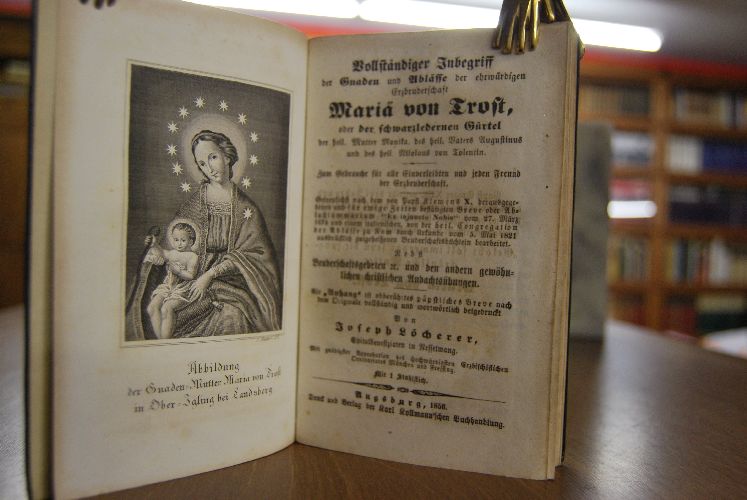 Vollständiger Inbegriff der Gnaden und Ablässe der ehrwürdigen Erzbruderschaft Maria von Trost oder der schwarzledernen Gürtel der heil. Mutter Monika, des heil. Vaters Augustinus und des heil. Nikolaus von Tolentin getreulichst nach dem von Papst Klemens X. herausgegebenen ... Breve oder Ablaßsummarium "Ex injuncto Nobis" vom 27. März 1675 und einem italienischen, von der heil. Congregation der Ablässe zu Rom durch Urkunde vom 5. Mai 1821 ausdrücklich gutgeheißenen Bruderschaftsbüchlein bearbeitet. Nebst Bruderschaftsgebeten etc. und den andern gewöhnlichen christlichen Andachtsübungen. Als "Anhang" ist obberührtes päpstliches Breve nach dem Originale vollständig und wortwörtlich beigedruckt.