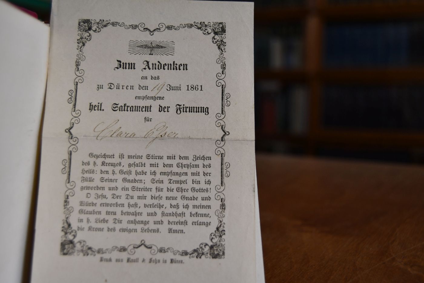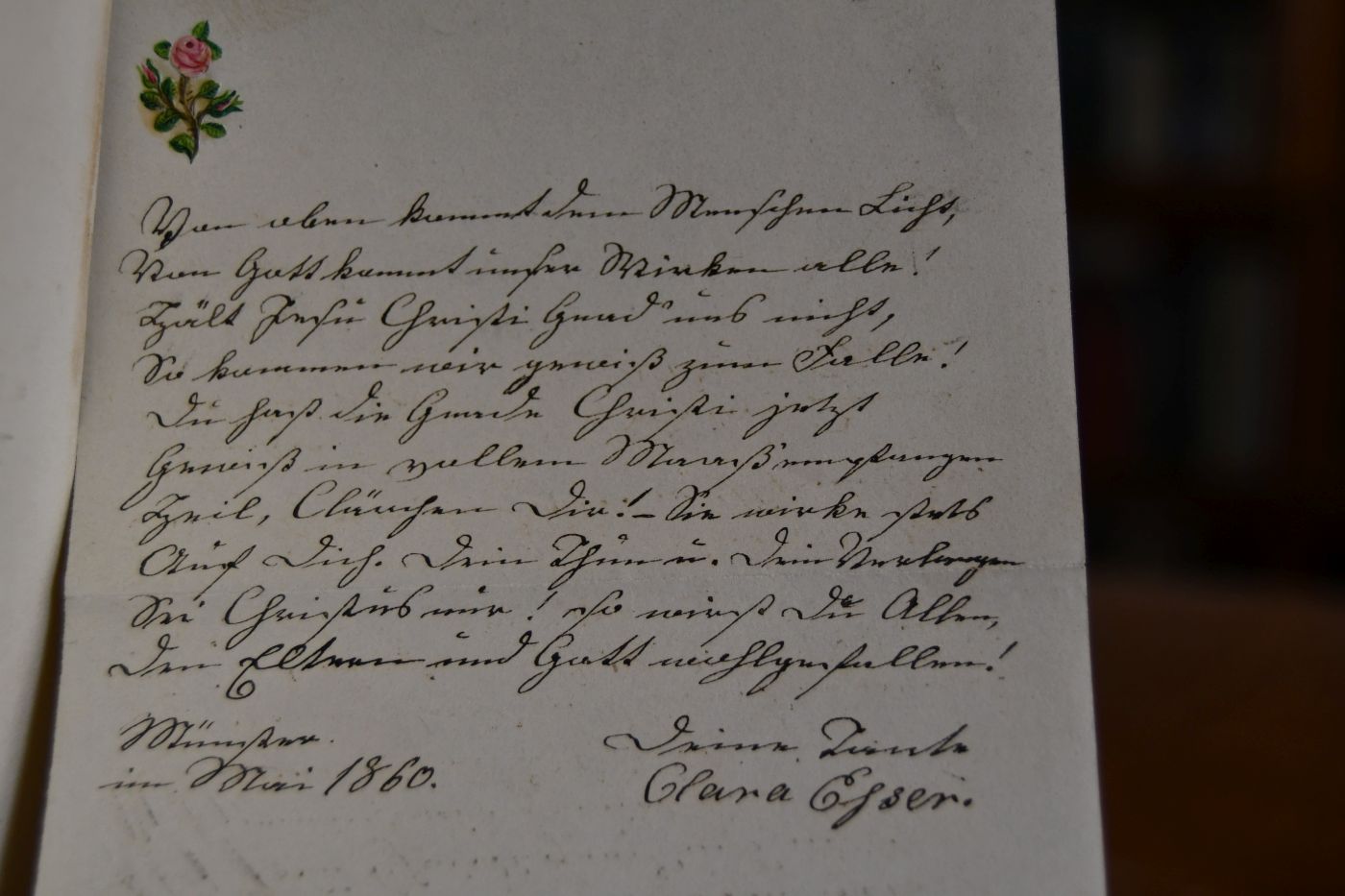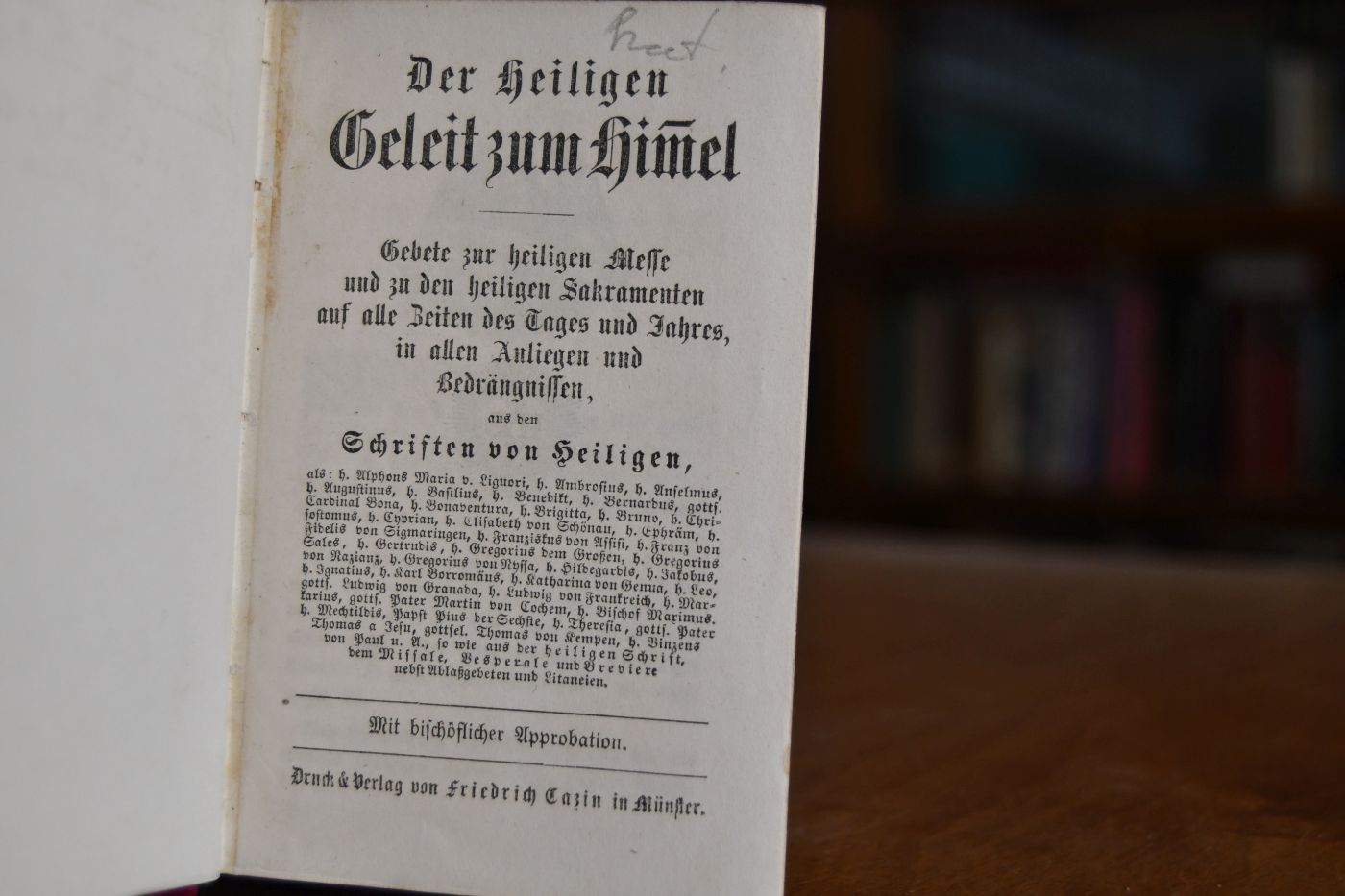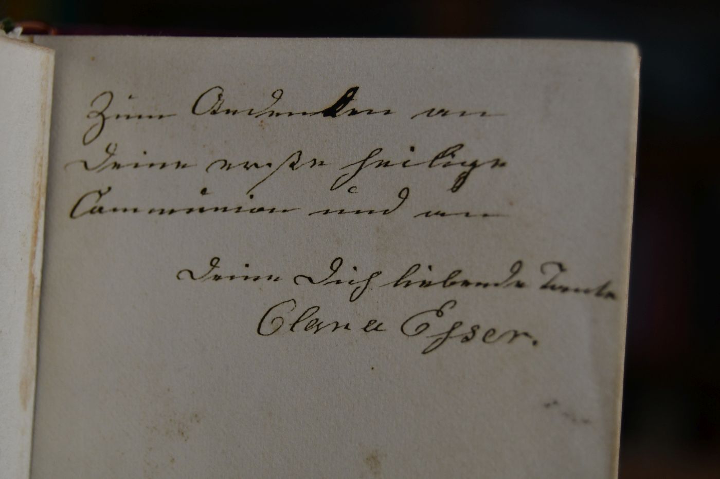 Beschreibung Einband berieben und bestoßen. Vorderdeckel vom Buchblock gelöst. Stahlstiche lose. Handschriftliche Widmung von Clara Esser (der Witwe von Professor Wilhelm Esser) an Ihre Nichte (ebenfalls Clara Esser). Beiliegend ein handschriftlicher Widmungsspruch von Clara Esser an Ihre Nichte (Münster, Mai 1860) und eine Totengedenkkarte für Frau Professor Esser. "Wilhelm Esser (* 21. Februar 1798 in Düren; † 6. Oktober 1854 ebenda) war ein deutscher Philosoph und Hochschullehrer. Esser erhielt zunächst vier Jahre Privatunterricht und ging dann an das Gymnasium in Düren. 1814 wechselte er nach Köln. Dort absolvierte er theologische, philosophische und philologische Studien, die er von 1816 bis zu deren Schließung 1818, an der Universität Münster fortsetzte. Er lehnte einen Ruf als Lehrer an das Lyceum Hosianum nach Braunsberg ab, um seinem akademischen Lehrer Georg Hermes an die neugegründete Universität Bonn zu folgen und seine Studien bei ihm fortzusetzen. Daneben hörte er klassische Philologie bei Karl Friedrich Heinrich und August Ferdinand Naeke. In Bonn wurde er 1821 mit der Dissertation De prima et altera pars quae fertur Nubium Aristophanis editione ad Elvenichium dissertatio zum Dr. phil. promoviert. Noch im selben Jahr habilitierte er sich an der Bonner Universität und lehrte anschließend als Privatdozent der Philosophie. Esser folgte 1823 einem Ruf als außerordentlicher Professor der Philosophie an die Akademie zu Münster und stieg dort 1826 zum ordentlichen Professor der Philosophie und Philologie auf. Zudem war er zweiter Direktor des philologischen Seminars der Akademie. Esser starb 1854 bei einem Ferienauftenhalt in seiner Heimatstadt." (Wikipedia)