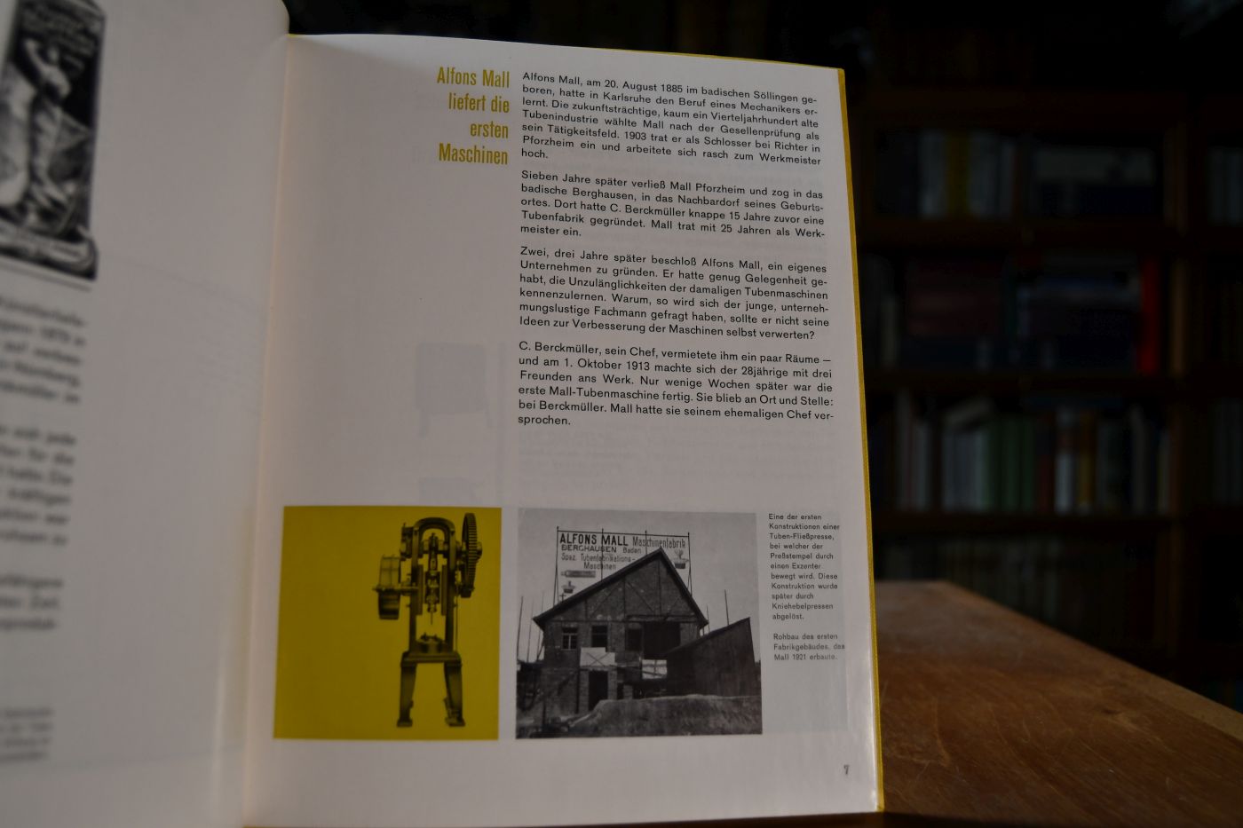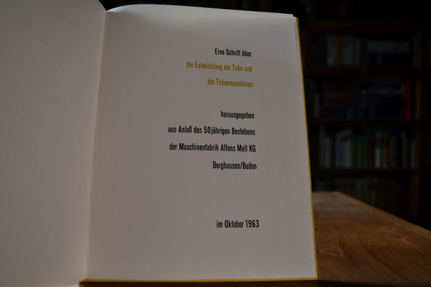 Eine Schrift über die Entwicklung der Tube und Tubenmaschinen. Herausgegeben aus Anlaß des 50jährigen Bestehens der Maschinenfabrik Alfons Mall KG, Berghausen/Baden im Oktober 1963.