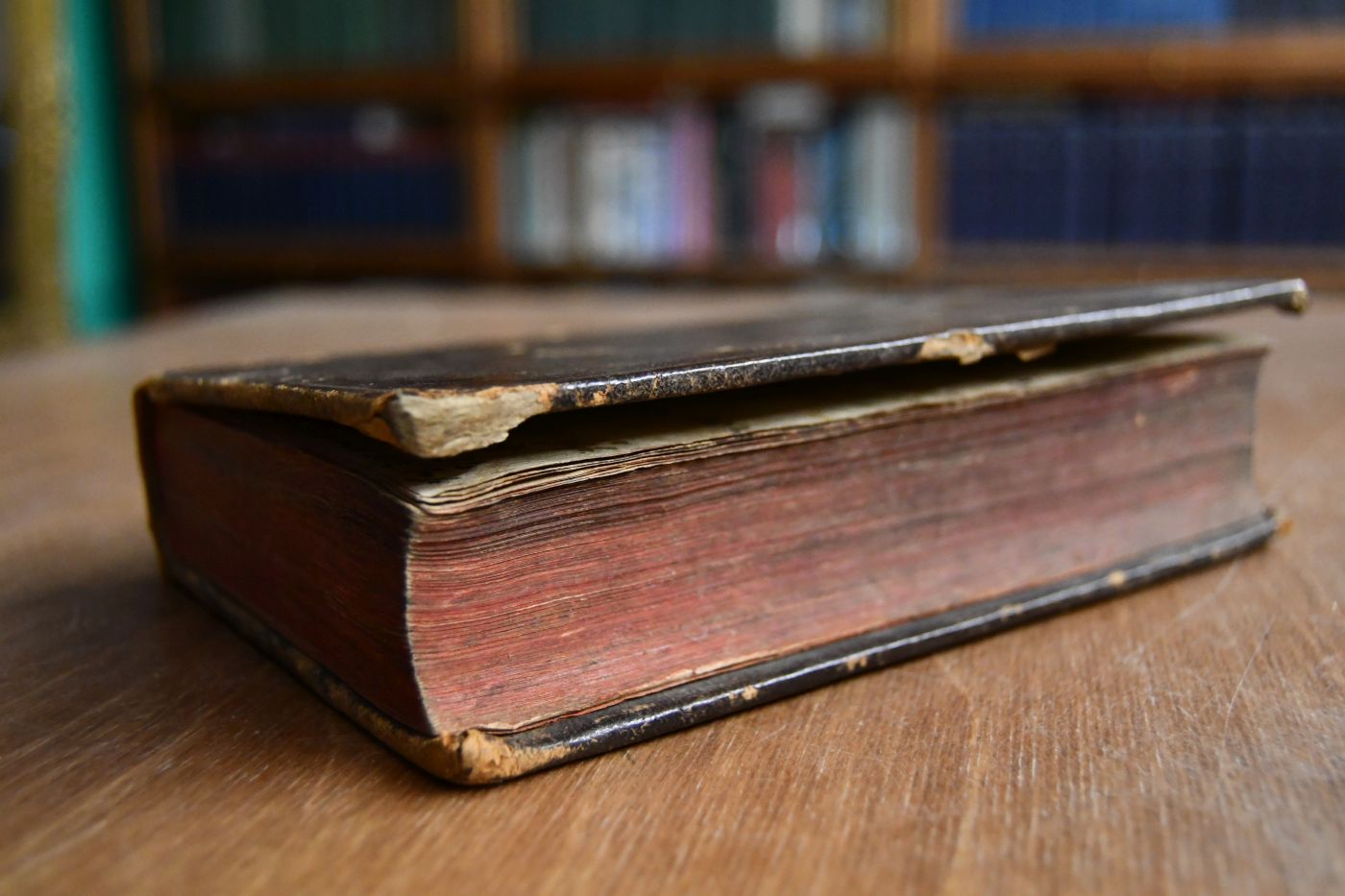 Format 18 x 12 cm, Leder der Zeit mit handschriftlichem Rückentitel und umlaufenden Rotschnitt