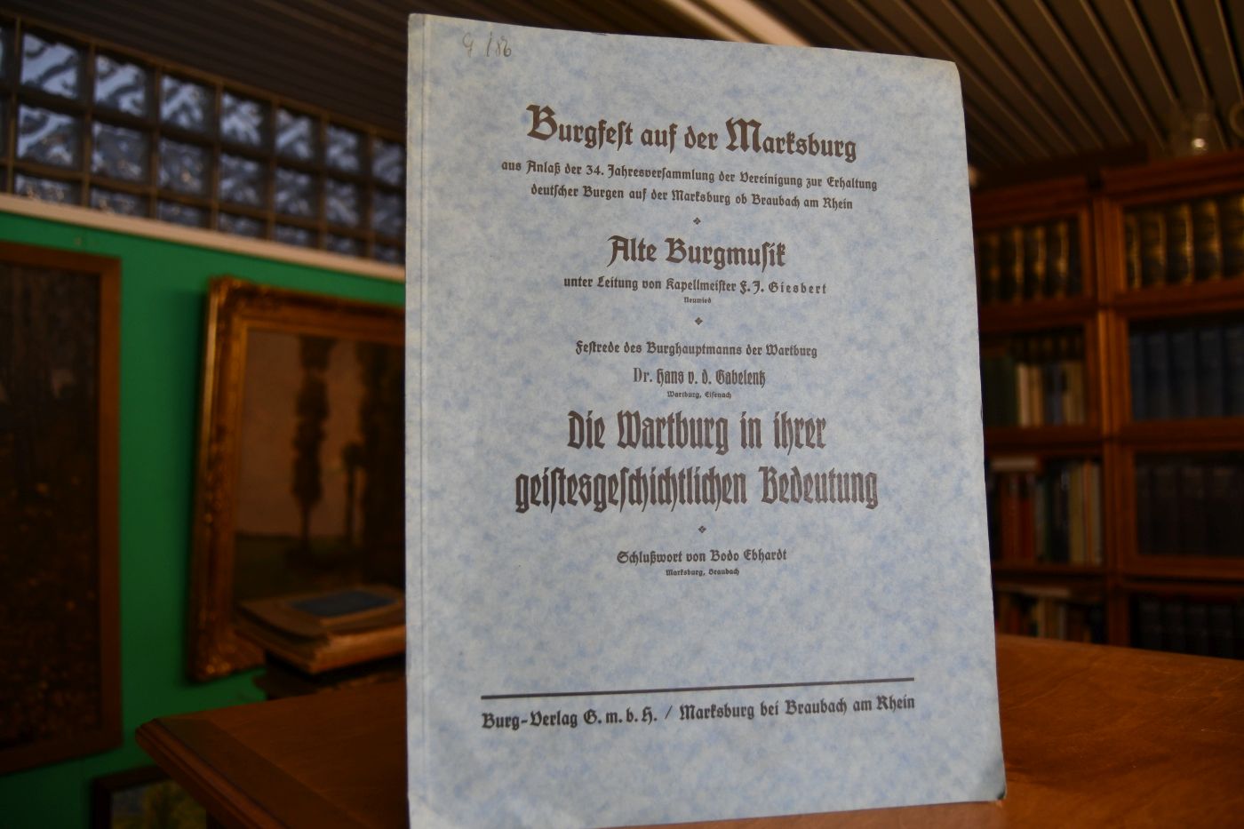 Burgfest auf der Marksburg aus Anlaß der 34. Jahresversammlung der Vereinigung zur Erhaltung deutscher Burgen auf der Marksburg ob Braubach am Rhein. Festrede des Burghauptmanns der Wartburg Hans v.d. Gabelentz Die Wartburg in ihrer geistesgeschichtlichen Bedeutung.