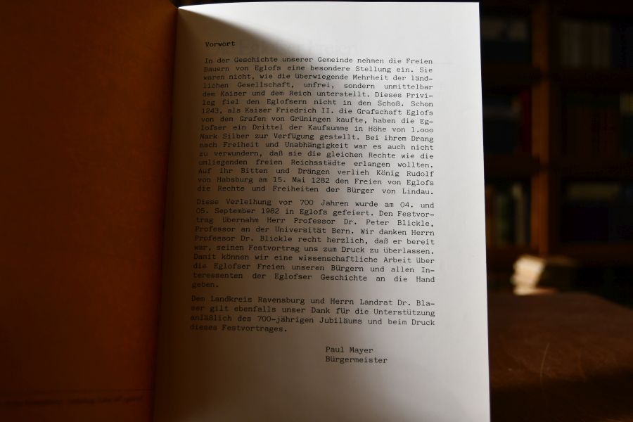 Die Eglofser Freien. Festvortrag vom 4. September 1982, anläßlich des 700-jährigen Jubiläums der Verleihung der Rechte und Freiheiten der Bürger von Lindau an die Bürger von Eglofs durch König Rudolf von Habsburg.