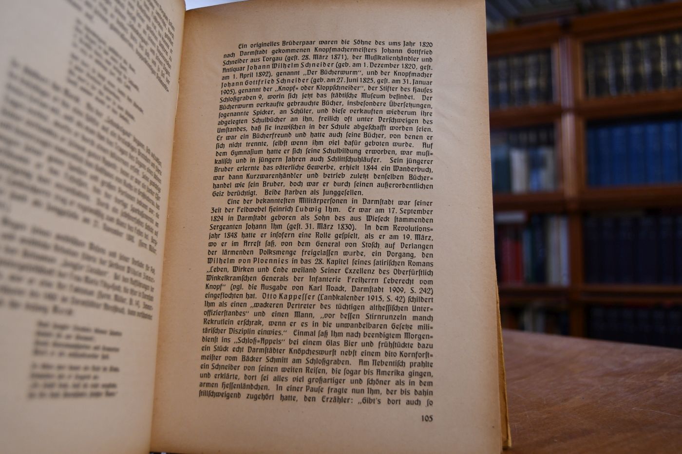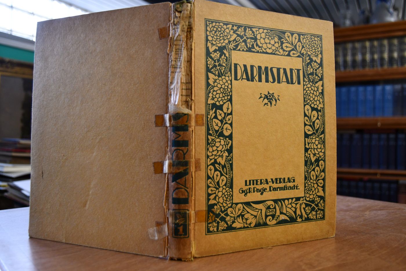 Darmstadt I. "Gedruckt in den Jahren 1917/18/19 in einer Auflage von 500 Abzügen und 20 nummerierten Abzügen auf Indiapapier, in der Hof-Buchdruckerei H. Hohmann, Darmstadt". Mit einem Holzschnitt "Blick auf die Stadtkirche" von A.M. Schwindt und einem Bildnis Großherzogs Ernst Ludwig von Hessen und bei Rhein.