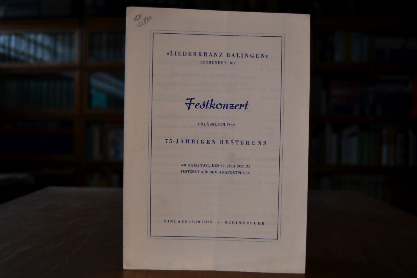 Liederkranz Balingen Festkonzert anlässlich des 75-jährigen Bestehens am Samstag, den 12. Juli 1952 im Festzelt auf dem Sportplatz.
