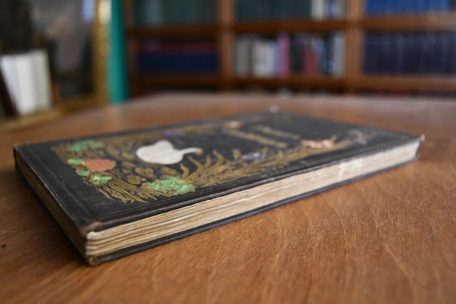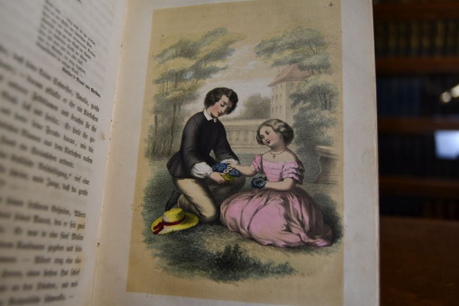 Beschreibung Einband berieben, bestoßen und fast ganz vom Block gelöst. Erste Lage (bis S. 2 hängt am Vorderdeckel, Block gebrochen. Gelegentlich fleckig. Die meisten Seidenhemdchen sind noch vorhanden. Die handkolorierten Lithographien sehr dekorativ. Wegehaupt IV, 848.
