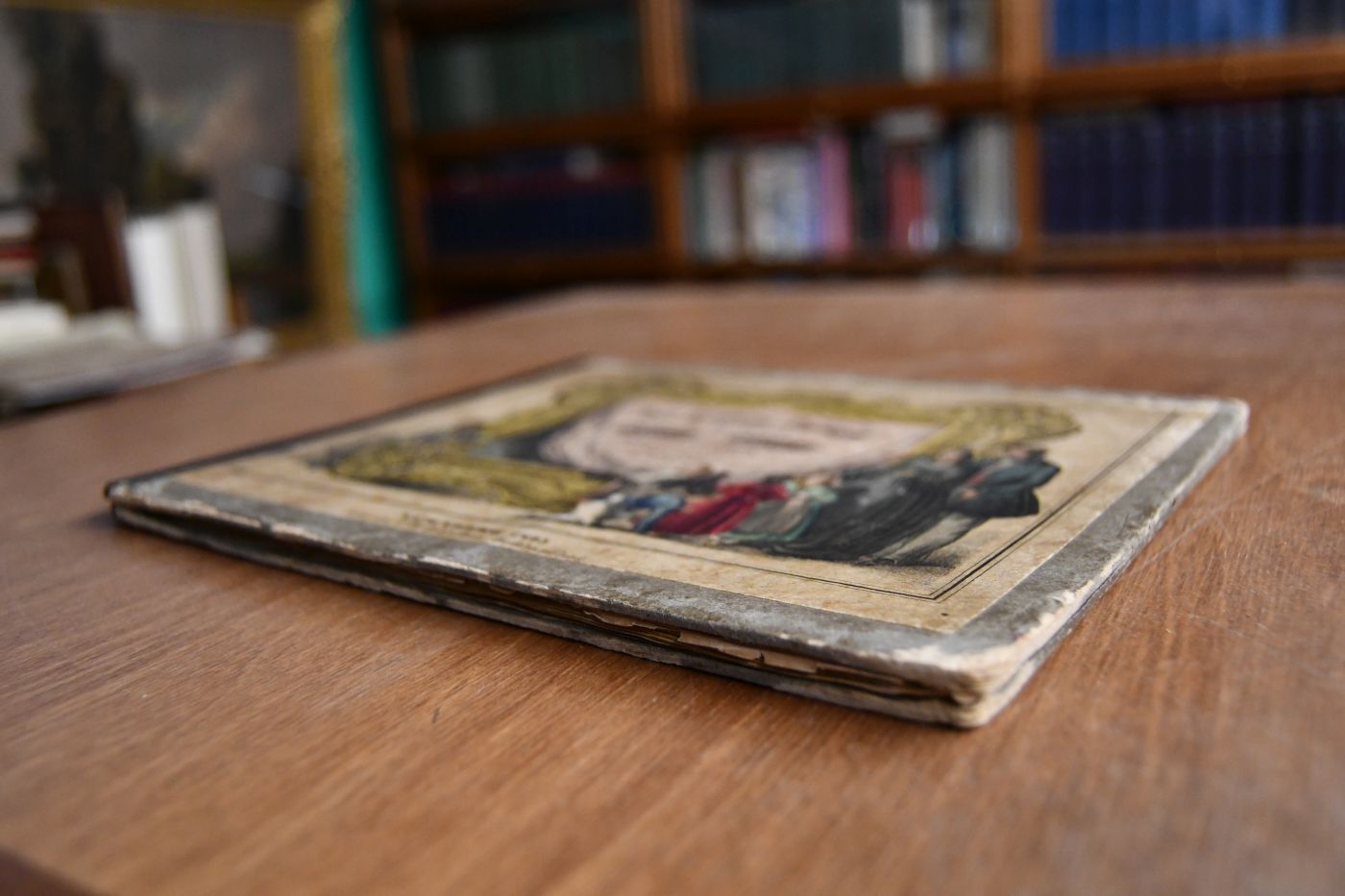 Format 18 x 23 cm, neu mit Textilklebeband verstärkter Pappband mit aufmontiertem koloriertem Titel