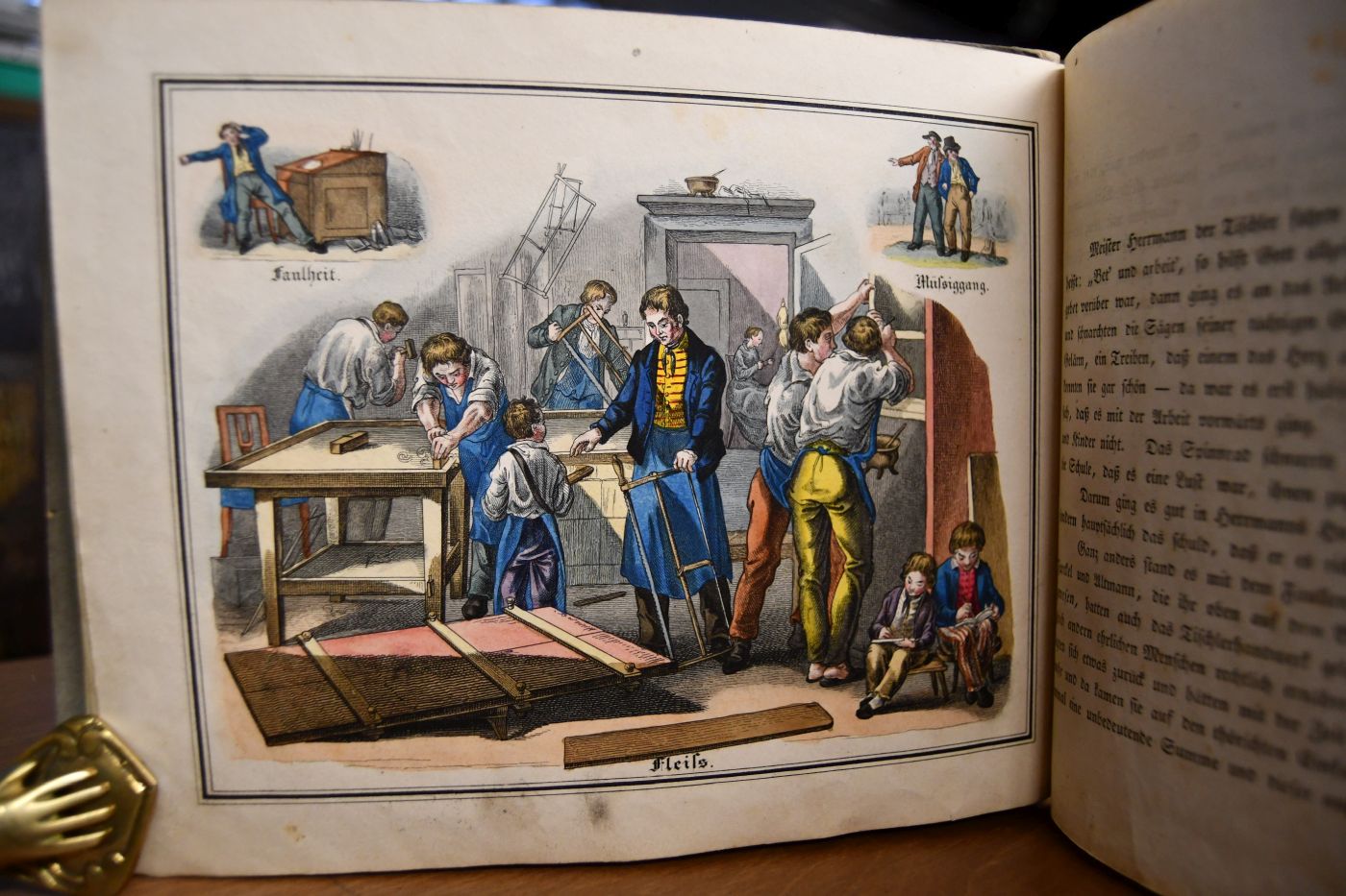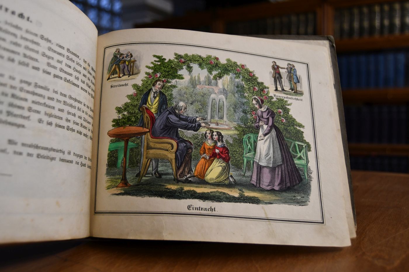 33 Haupt- und Nebenbilder auf 12 fein illuminierten Kupfertafeln mit kurzen moralischen Erzählungen.