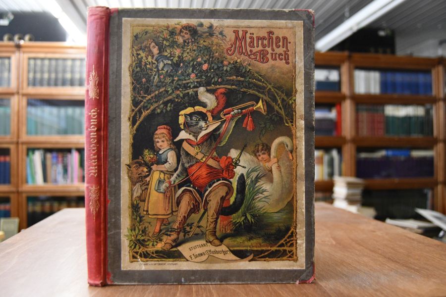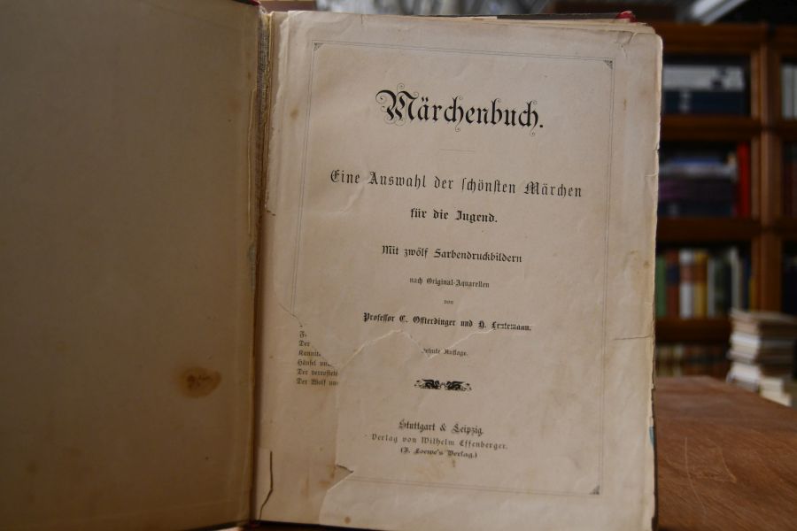 Beschreibung Einband berieben, bestoßen und fleckig. Bindung gelockert. Einige Seiten am Anfang und am Ende lose und mit Einrissen. Ein Textblatt mit Textverlust, ebenso eine Illustration. Sehr gebrauchtes Kinderbuch, mit vielen Beschädigungen. Vollständig. Brauchbares Belegexemplar dieses seltenen und dekorativen Buches. Illustration zu Hänsel und Gretel mit Bleistiftumfahrungen der Figurumrisse.