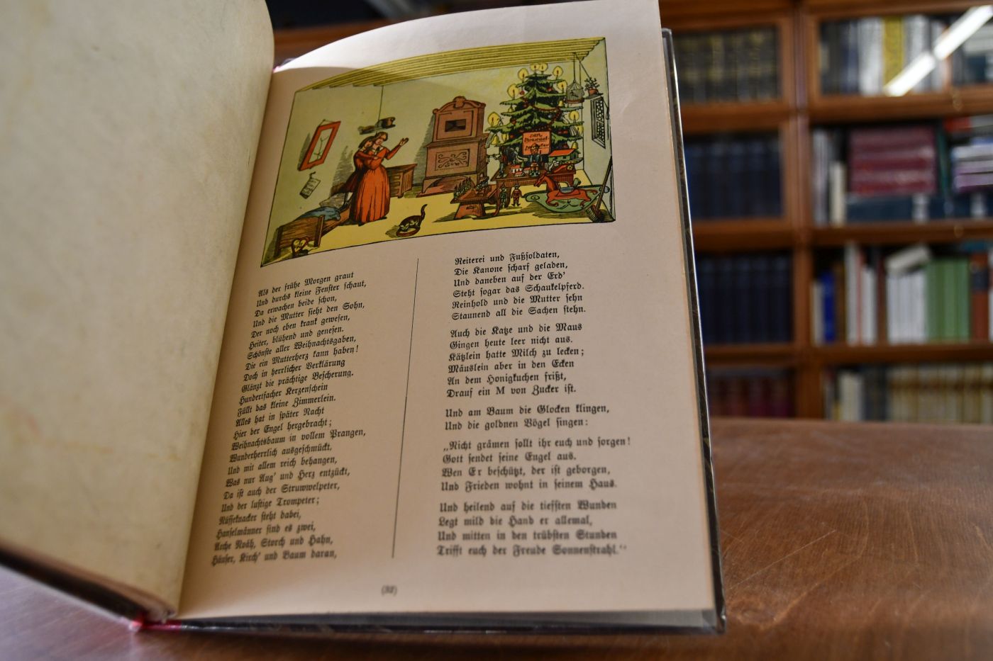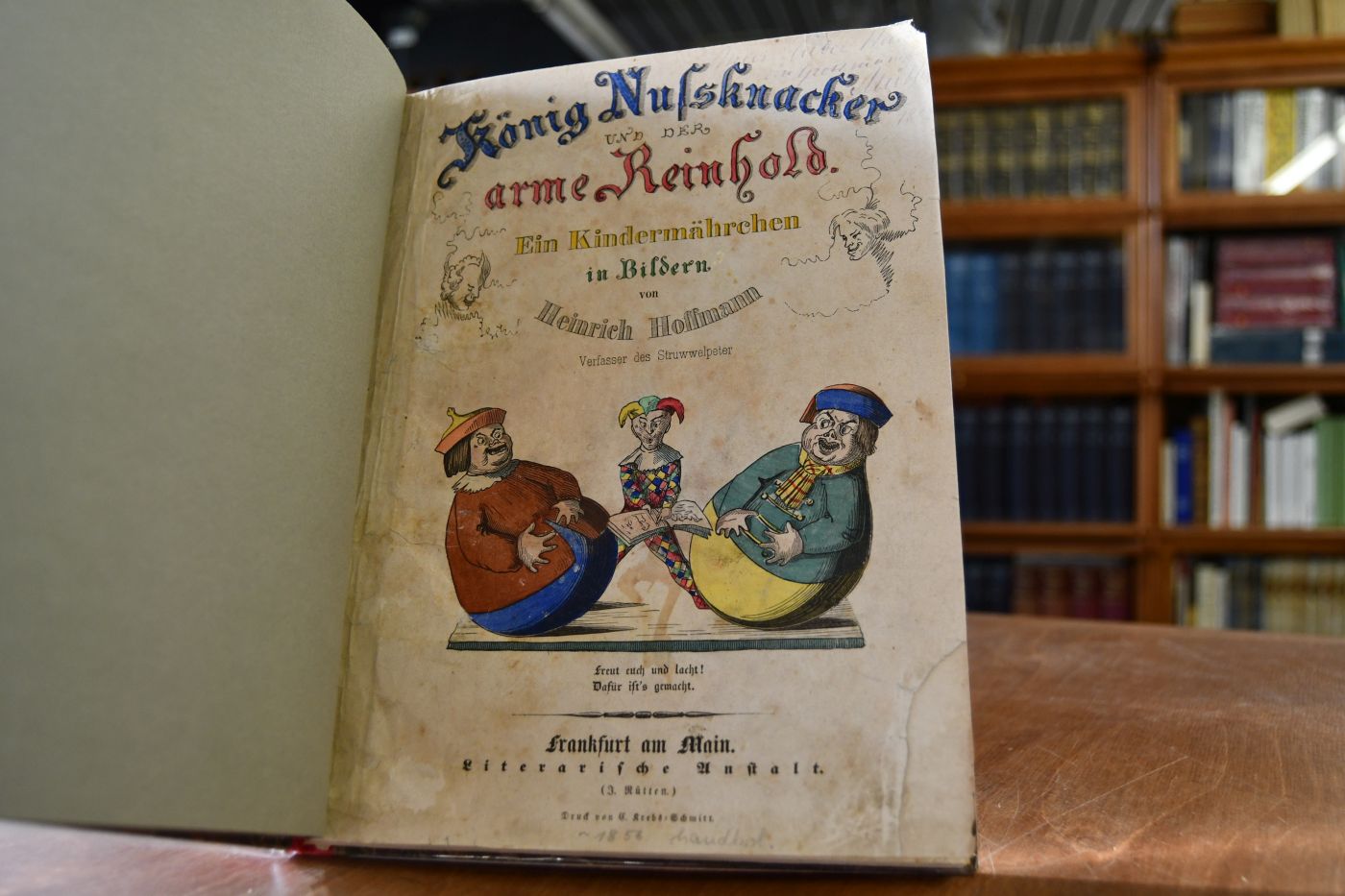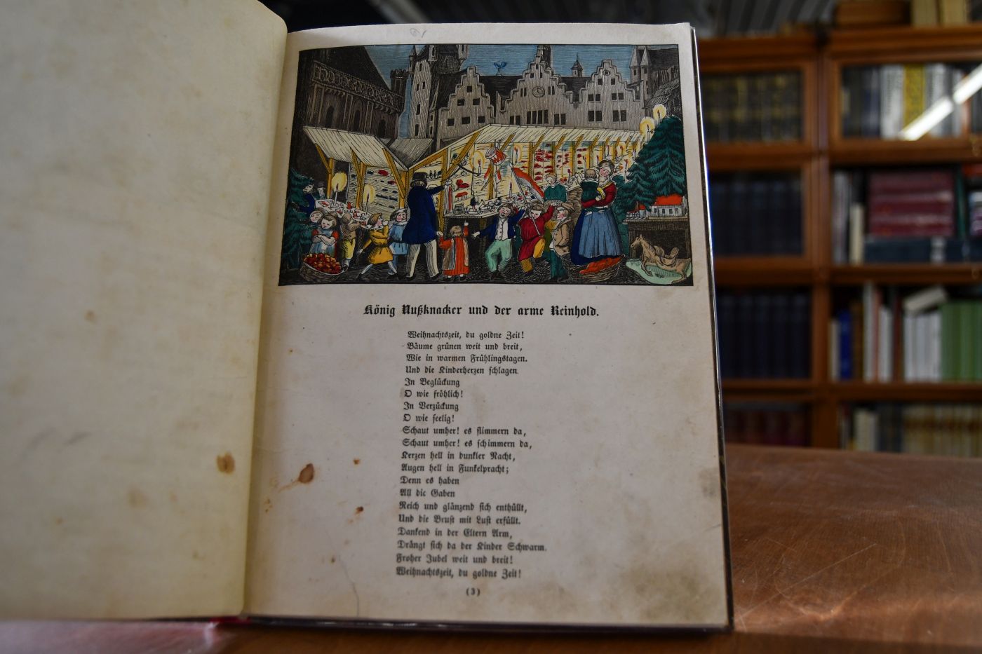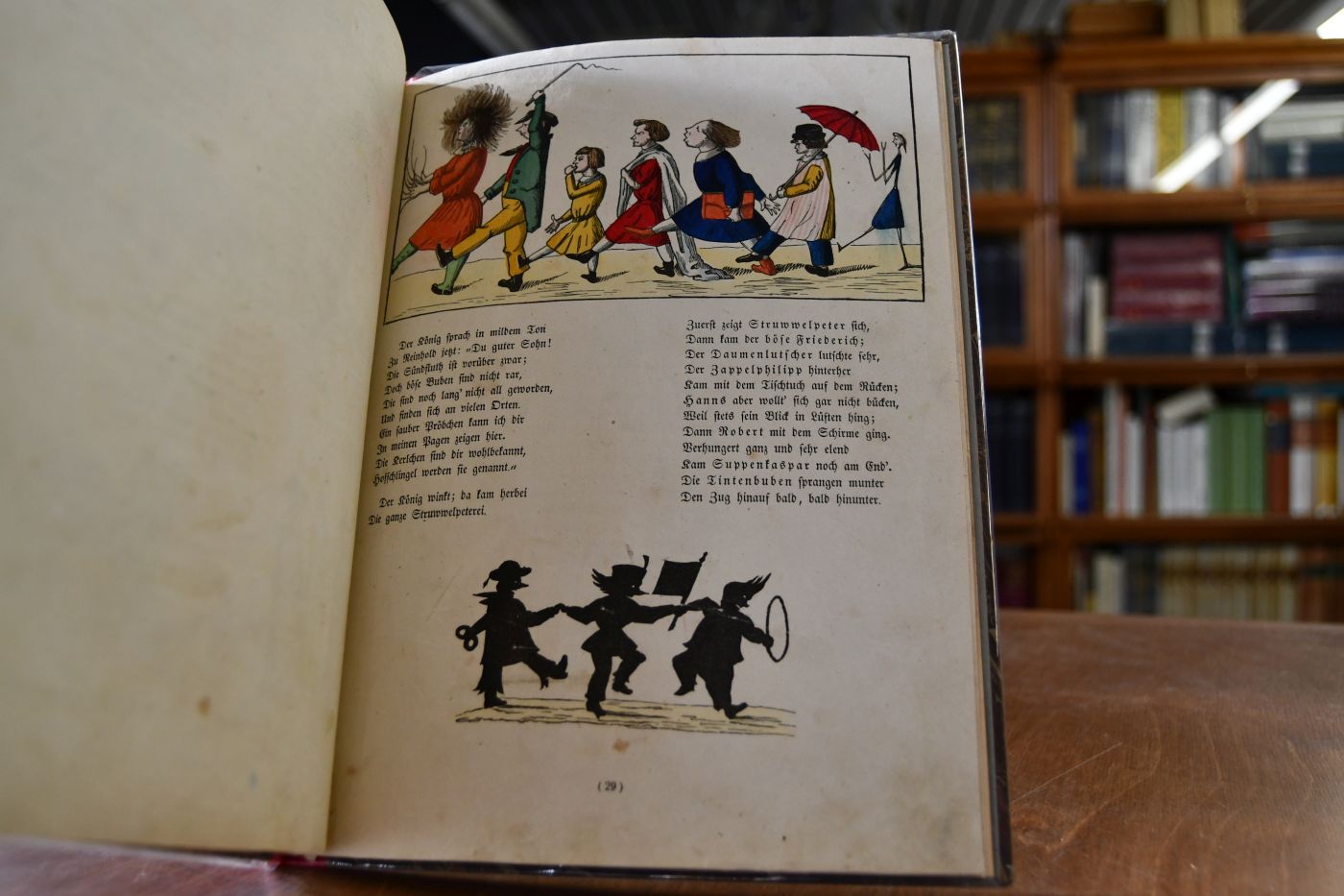 Beschreibung Durchgehend fleckig und angeschmutzt. Private handschriftliche Widmung auf dem Titelblatt. Einige, z.T. hinterlegte Einrisse. Gebrauchtes Kinderbuch. In seinem zweiten Bilderbuch nach dem legendären »Struwwelpeter« und diesem im Erfolg am nächsten kommend, ließ Heinrich Hoffmann Spielzeugfiguren, die er während einer Reise in Nürnberg gekauft hatte, in märchenhafter Weise lebendig werden, um »die Märchenwelt herunter in die den Kindern vertraute Spielsachenwelt der Kinderstube zu bringen« (Heinrich Hoffmann, zitiert nach Wegehaupt). – Heinrich Hoffmann (1809–1894) war promovierter Mediziner und behandelte in einer Armenklinik mittellose Patienten. In Frankfurt ließ er eine neue Klinik für Psychiatrie errichten, in der die Patienten nicht weggesperrt, sondern therapiert wurden, für damalige Verhältnisse ein ungeheuerliches Novum.