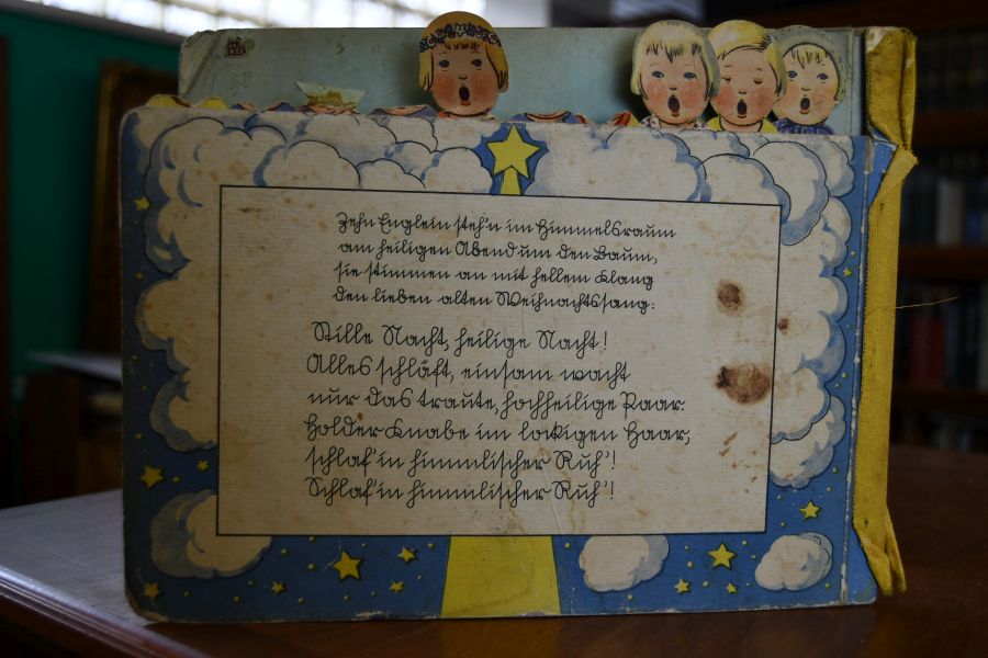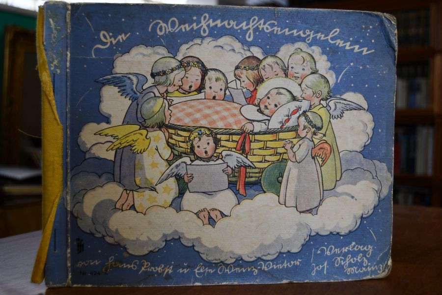 Beschreibung Einband berieben und bestoßen. Rückdeckel mit Verlust. Von den 10 Engelsköpfen sind vier noch vorhanden, zwei weitere liegen lose bei. Die noch vorhandenen Engelsköpfe mit Papierverstärkungen und Montagespuren. Die schwarz-weiß Zeichnungen handcoloriert. Einige Figuren mit Bleistift nachgezogen (zum durchpausen). Stark gebrauchtes Kinderbuch der Erstauflage. Immer wieder fleckig. Doderer III, 789.