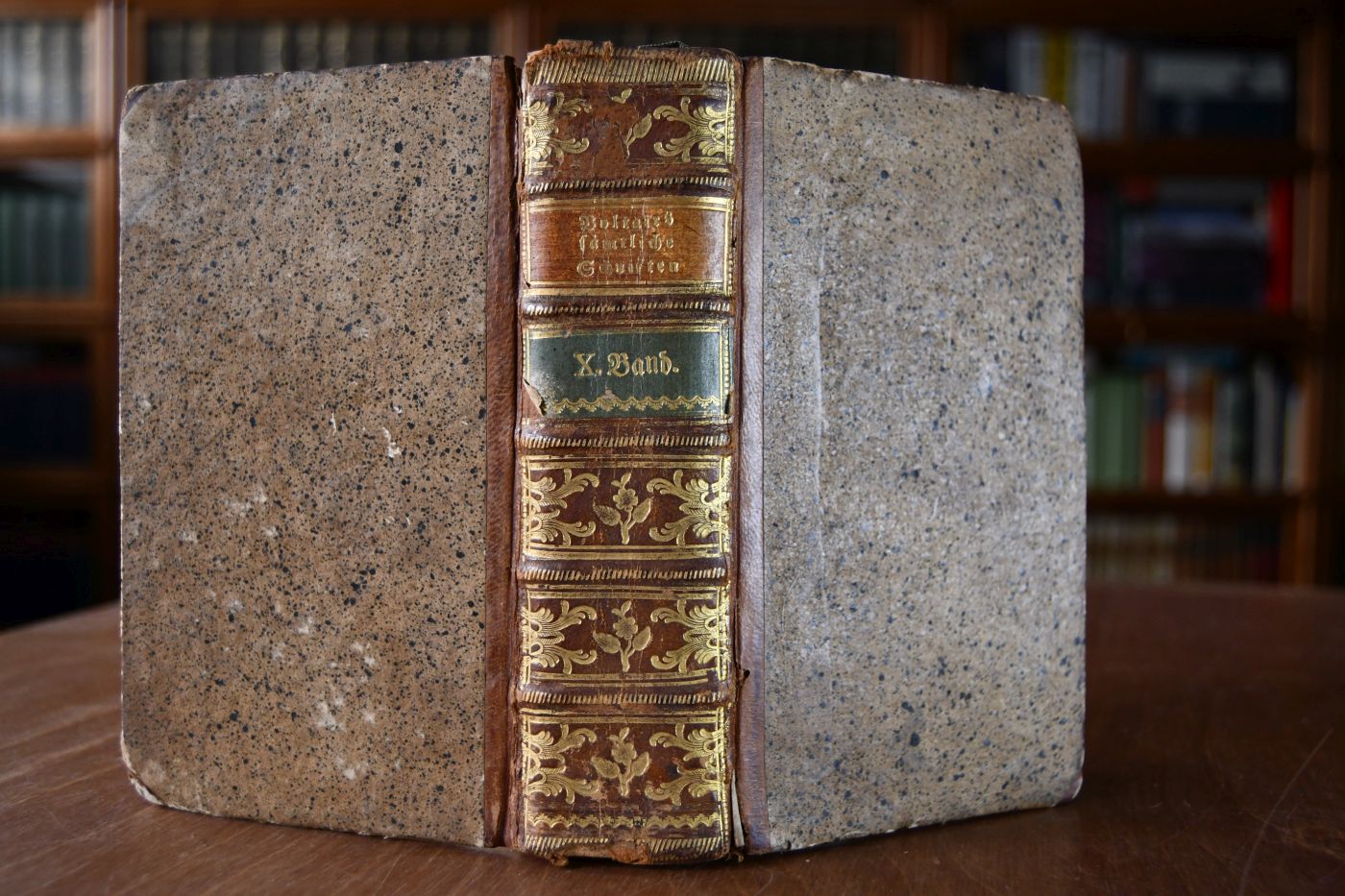 Format 17 x 11 cm, Halbleder der Zeit mit 5 Bünden, zwei Rückenschilden und Rückenvergoldung sowie umlaufendem Rotschnitt