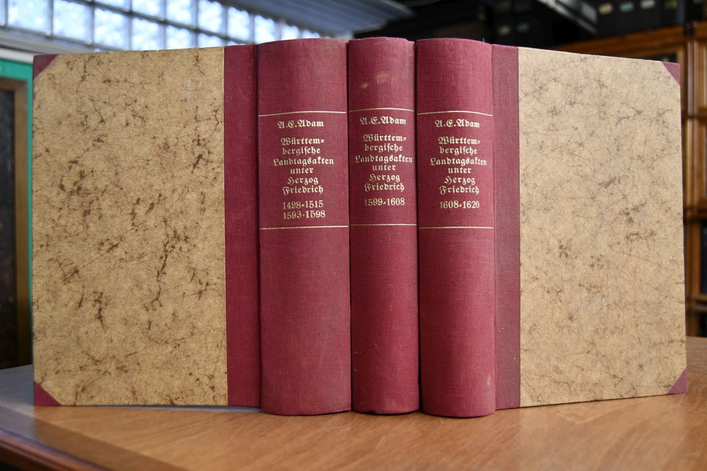 Württembergische Landtagsakten. 4 Bde. in 3 Bdn. I. Reihe 1. Bd. 1498-1515; II. Reihe 1. Bd. 1593-1598, II. Reihe, 2. Bd. 1599-1608,