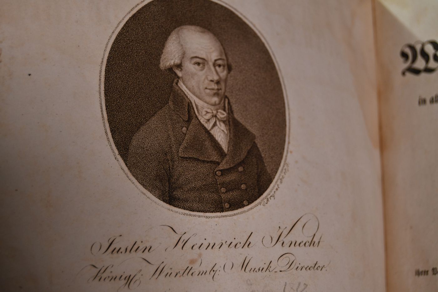 Beschreibung Einband berieben, bestoßen und mit deutlichem Verlust des Überzugpapiers. Bindung gelockert und einige Lagen lose und vorgefallen sowie mit RAndeinrissen. Durchgehend fleckig und feuchtigkeitsrandig. Einige Tintenflecke. Handschriftliche Besitzereinträge (u.a. Stiftung Derendingen) auf Innendeckel und Vorsätzen. Porträtkupfer mit Randeinriss (nicht in die Abbildung hineinreichend). S. 285/286 und 287/288 sind vertauscht, ebenso 289/290 und 291/292. Heyd II, 354. Johann Heinrich Knecht (1752-1817) war in seiner Jugend Kompositeur für das städtische Liebhaberorchester Wielands in Biberach. Eine Inkunabel der Lithographie.