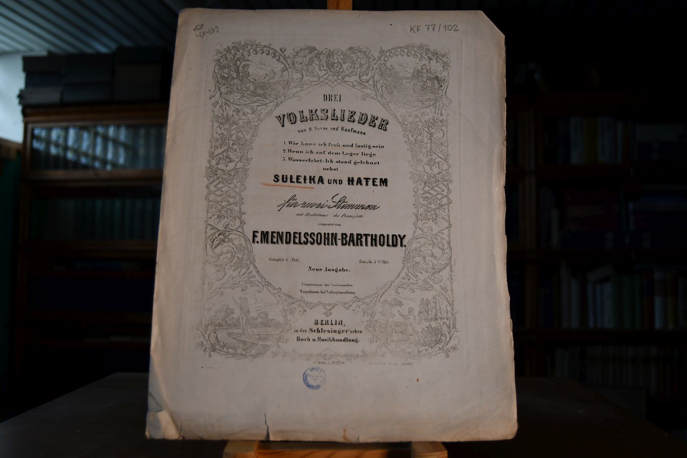 Suleika und Hatem, Duett aus Göthe`s Divan 14 für Sopran und Tenor, aus Op. 8. Drei Volkslieder von H. Heine und Kaufmann 1. Wie kann ich froh und lustig sein. 2. Wenn ich auf dem Lager liege. 3. Wasserfahrt Ich stand gelehnt, nebst Suleika und Hatem für zwei Stimmen mit Begleitung des Pianoforte.