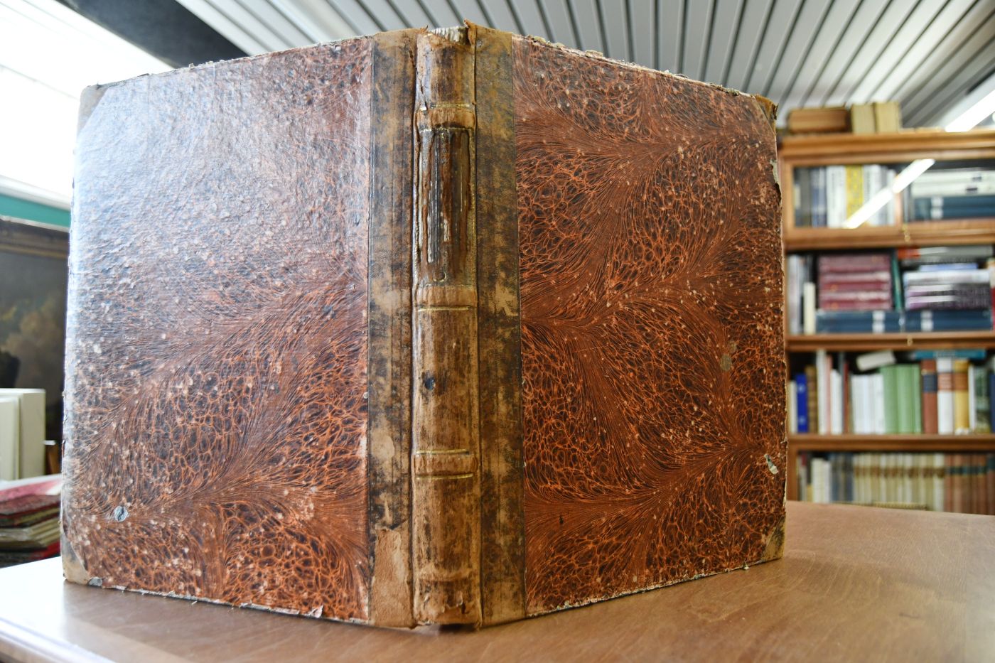 Format 33 x 27 cm, Halbleder der Zeit mit umlaufenden Sprengschnitt