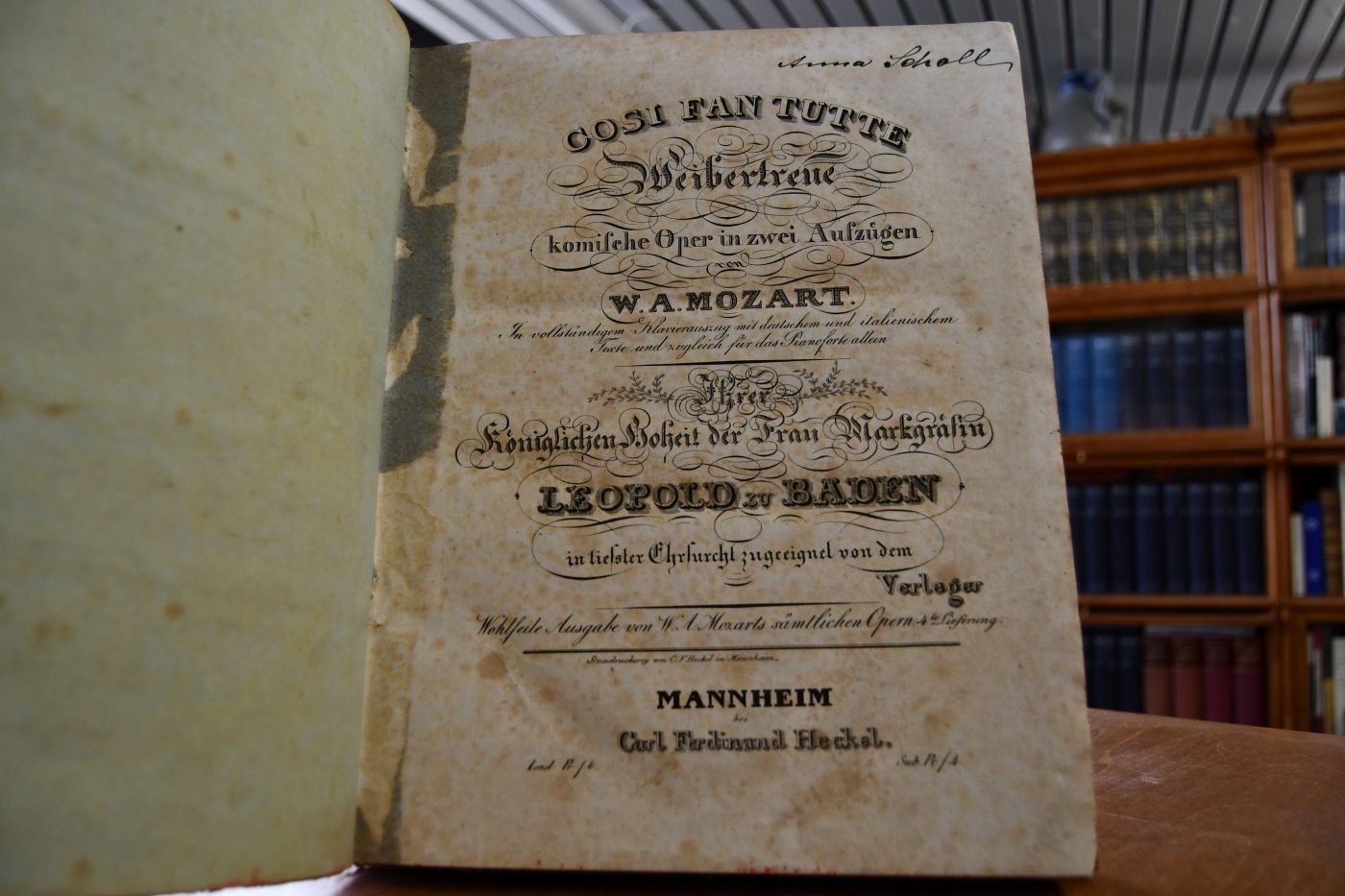 Cosi fan tutte. Weibertreue, komische Oper in zwei Aufzuegen. In vollständigem Klavierauszug mit deutschem und italienischem Texte und zugleich für das Piano-Forte allein. Ihrer Koeniglichen Hoheit der Frau Markgraefin Leopold zu Baden in tiefster Ehrfurcht zugeeignet von dem Verleger. Wohlfeile Ausgabe von W.A. Mozarts sämtlichen Opern. 4te Lieferung.