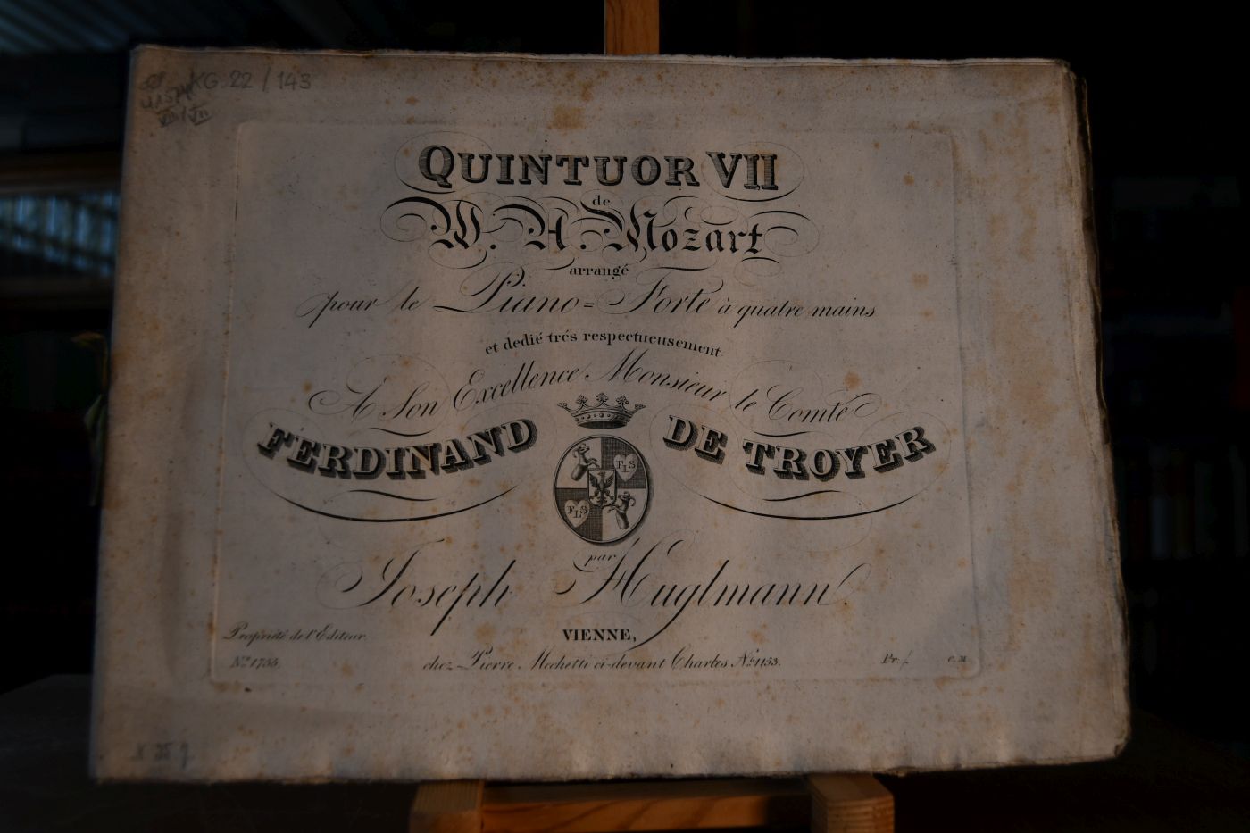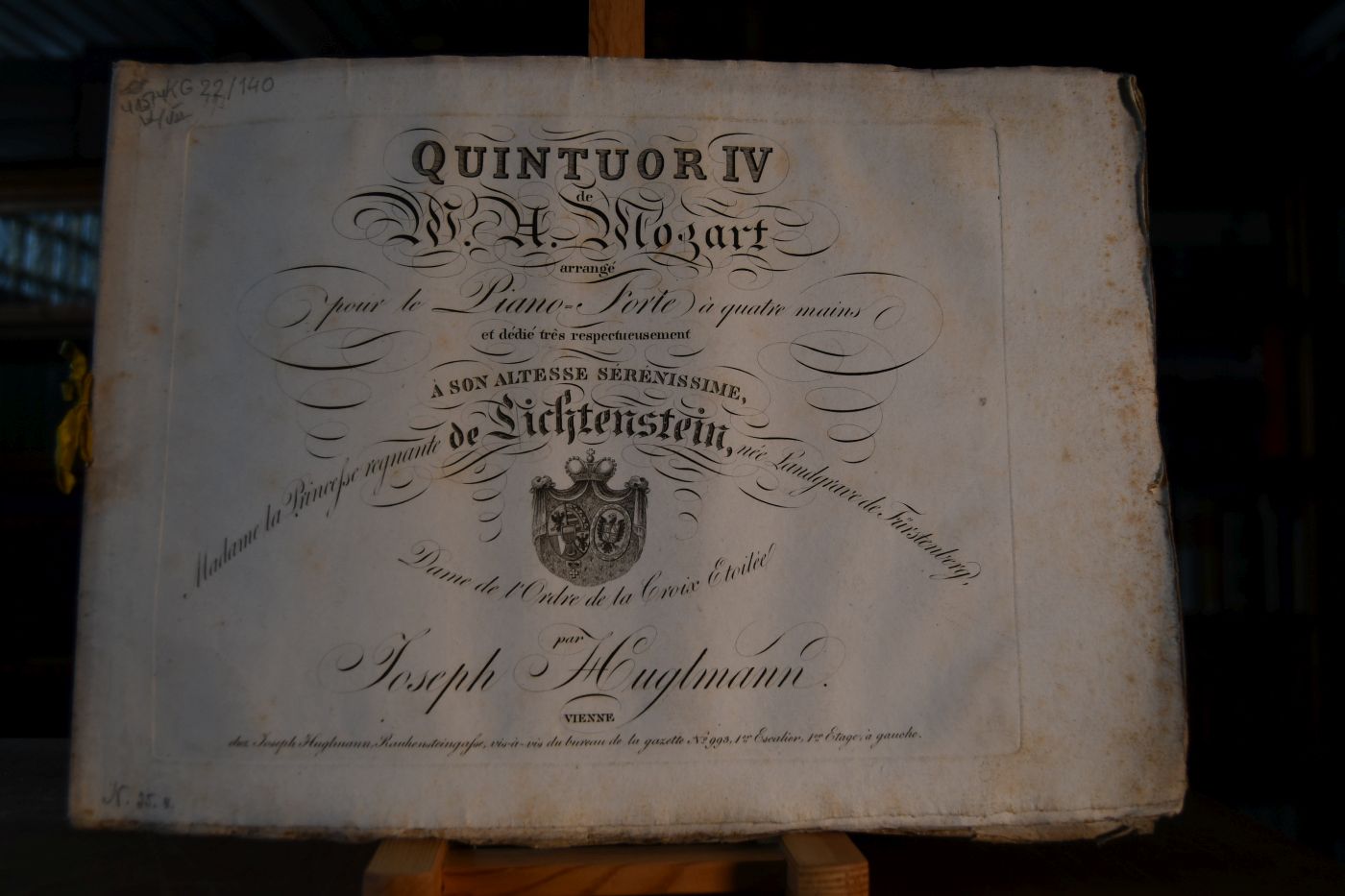 Quintuor I-VII de W.A. Mozart arrange pour le Piano-Forte a quatre mains par Joseph Huglmann. Widmungen von Huglmann Bd. 1 dedie tres respectueusement A Son Alteße Serenißime Monsigneur le Prince Innocent d`Odescalchi. Bd. 2 dedie a Madame Josephine de Wadassz nee Schill. Bd. 3 dedie a Madame la Comtesse de Choiseul Daillecourt nee Comtesse de Sereny. Bd. 4 dedie a son Altesse Serenissime Madame la Princesse regnante de Lichtenstein, nee Landgrave de Fürstenberg. Bd. 5 dedie a son Altesse Madame Francoise Princesse de Liechtenstein, nee Comtesse de Wrbna. Bd. 6 dedie a Madame la Comtesse de Trautmannsdorff, nee Comtesse de Karolyi. Bd. 7 dedie a son Excellence Monsieur le Comte Ferdinand de Troyer.