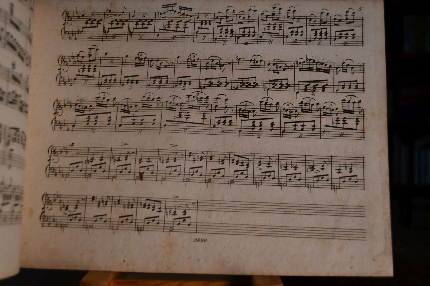 Beschreibung Berieben, bestoßen, angeschmutzt und fleckig. Handschriftlicher Besitzereintrag auf Deckblatt. Durchgehend fleckig. Letzte Seite oben mit etwas Notenverlust beschnitten. Eine Inkunabel der Lithographie.