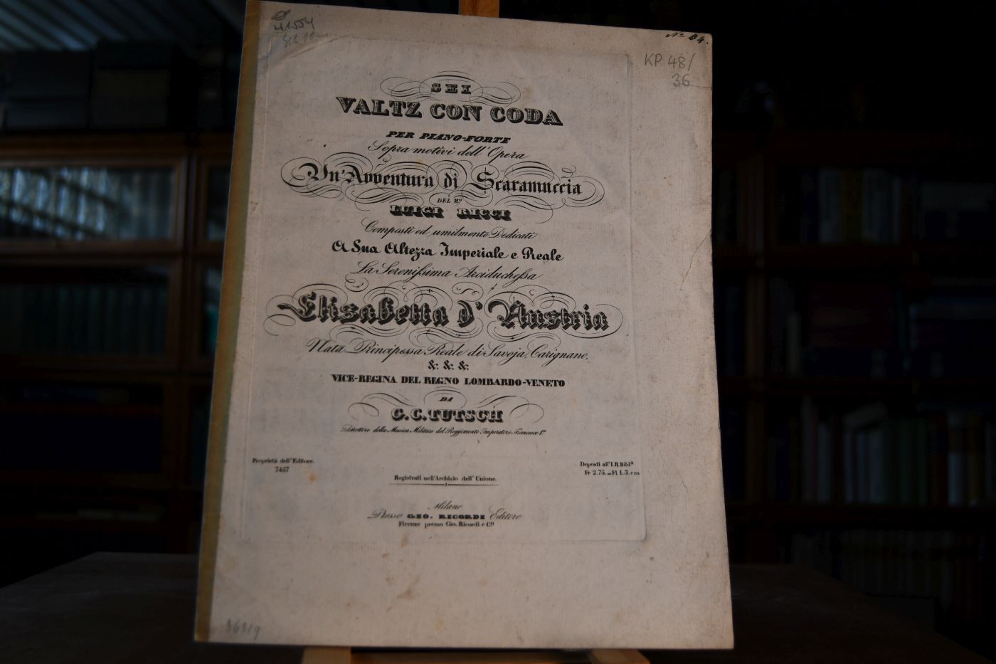 Sei Valtz con coda per Piano-Forte sopra motivi dell` Opera Un` Avventura di Scaramuccia del Mo. Luigi Ricci composti ed umilmente dedicati a sua Altezza Imperiale e Reale La Serenissima Arciducheßa Elisabetta d` Austria nata Principessa Reale di Savoja Carignano etc. Vice-Regina del Regno di Savoja-Veneto da G.C. Tutsch Direttore della Musica Militare del Reggimento Imperatore Fiancesco I.