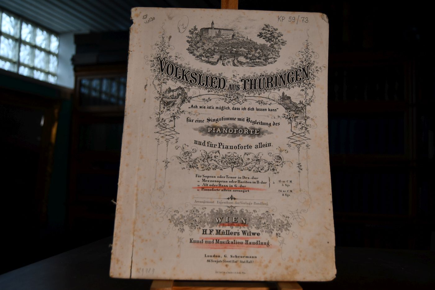 Beschreibung Berieben, bestoßen, angeschmutzt, fleckig. mit Einrissen und Verlust. Hinterlegter Bug. Mit Thüringer Ansichten auf Deckblatt.