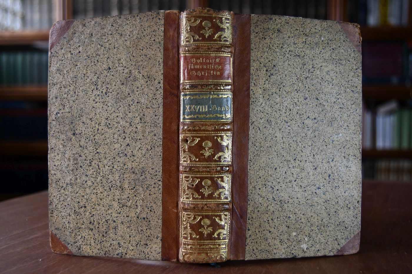 Format 17 x 11 cm, Halbleder der Zeit mit 5 Bünden, zwei Rückenschilden und Rückenvergoldung sowie umlaufendem Rotschnitt
