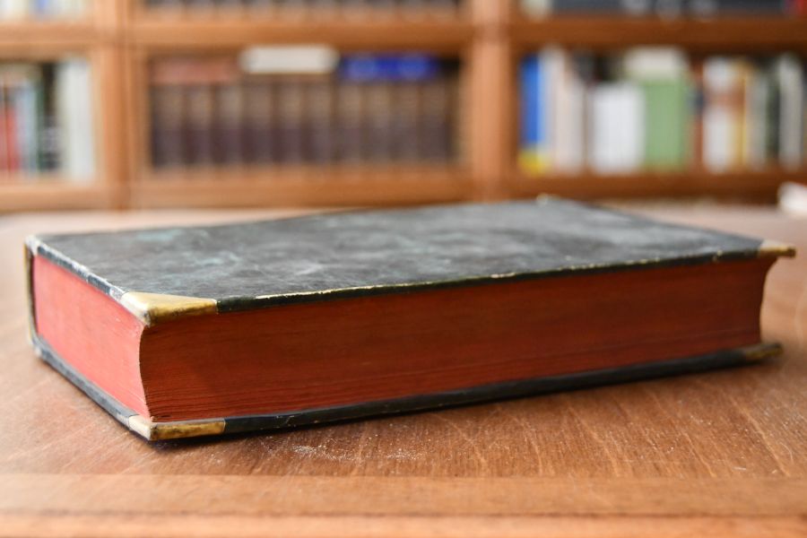 Format 21 x 14 cm, Pappband mit Rückenschild und umlaufendem Rotschnitt