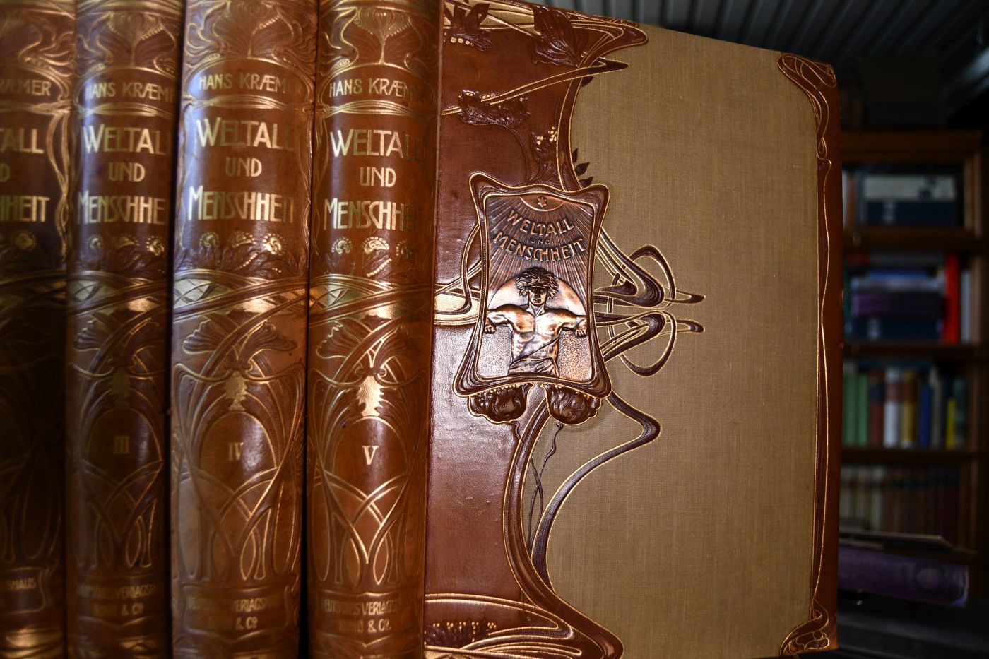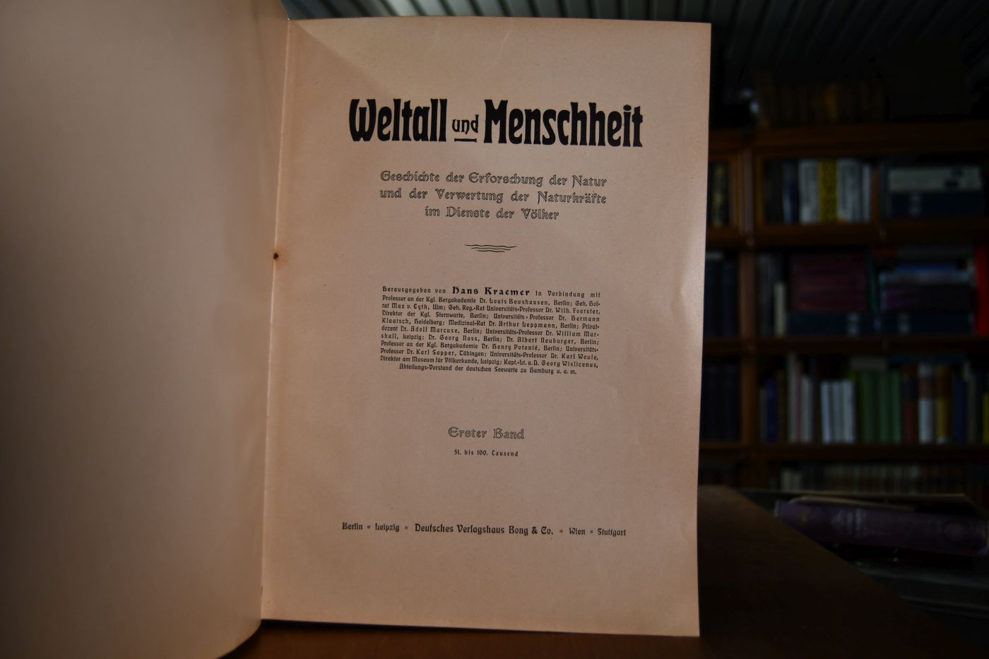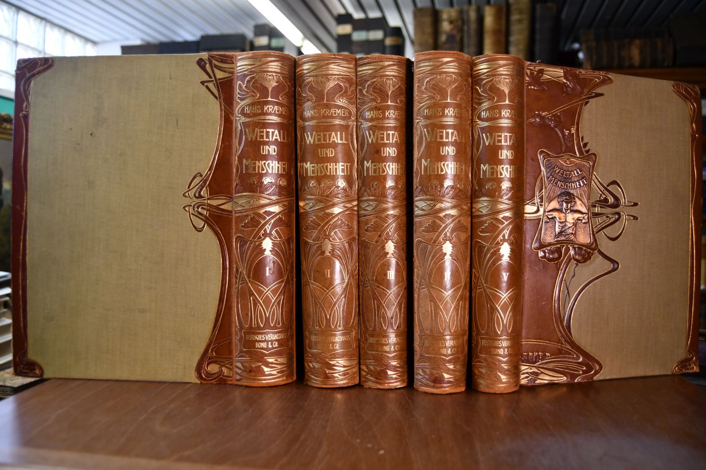 Beschreibung Einband berieben, bestoßen und angeschmutzt. Glegentlich etwas fleckig und mitetwas korrodierten Heftklammern. Besitzerstempel (Georg Bihler, Laichingen) auf fliegendem Vorsatz. Vorsatz von Bd. 5 mit Knickspur. In Bd. 2 mit beiliegenden 6 Tafeln zur vergleichenden Anatomie des Kopfes von Mensch und Gorilla. Band 4 mit dem Faksimile des ersten Berichtes Cristobal Colons (Kolumbus) über die Entdeckung Amerikas im Jahre 1492.