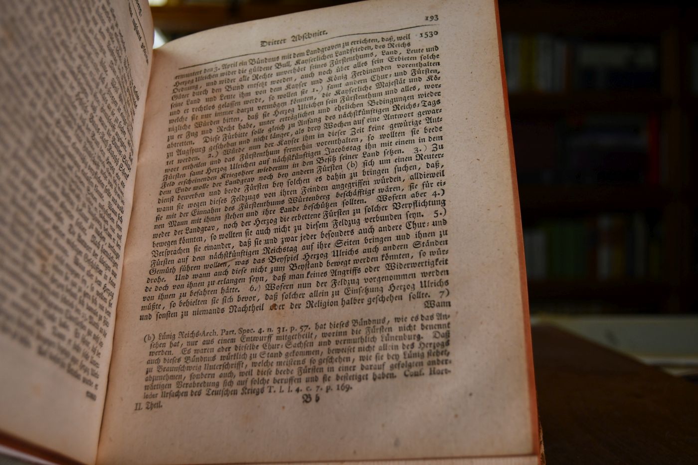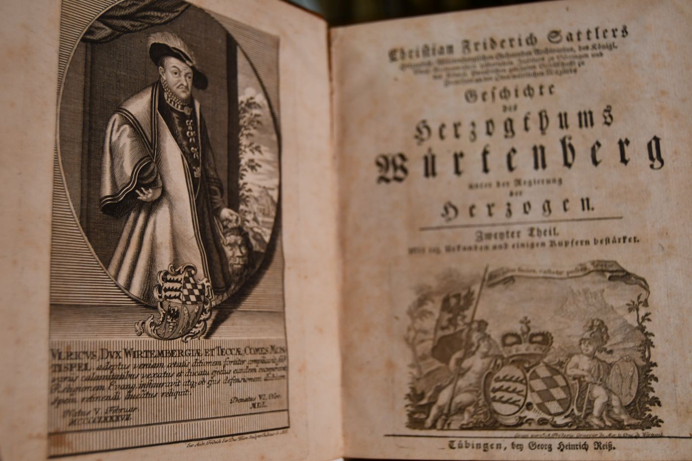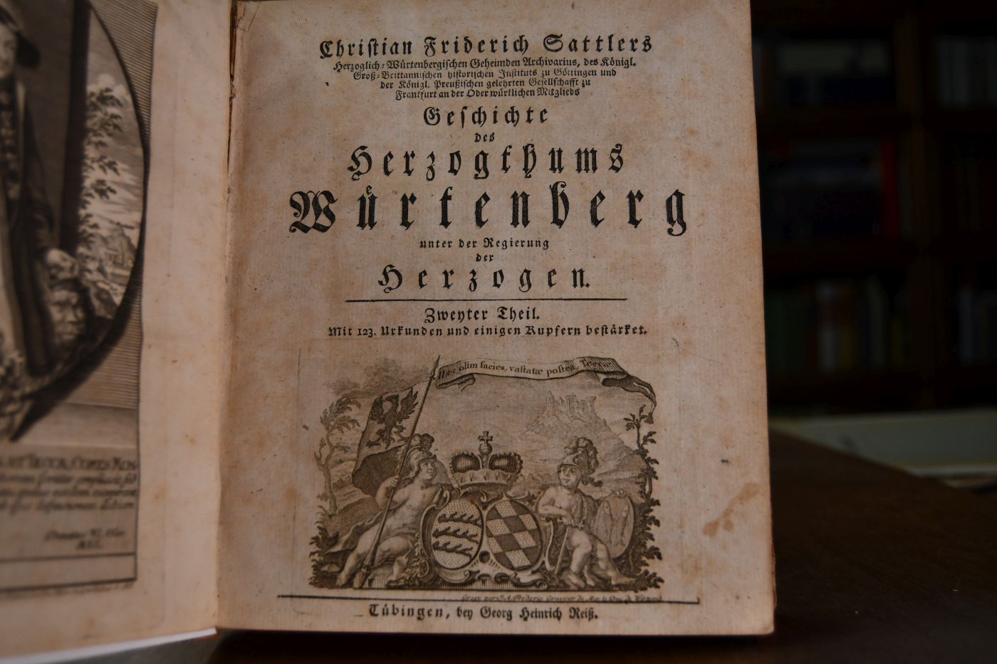 Seiten 6 Bll., 260, 264 S., 8 Bll. mit 1 gest. Porträttafel (Herzog Ulrich) und 1 gestochenen Münztafel sowie 2 Vignetten (gestochen von Kretschmer)