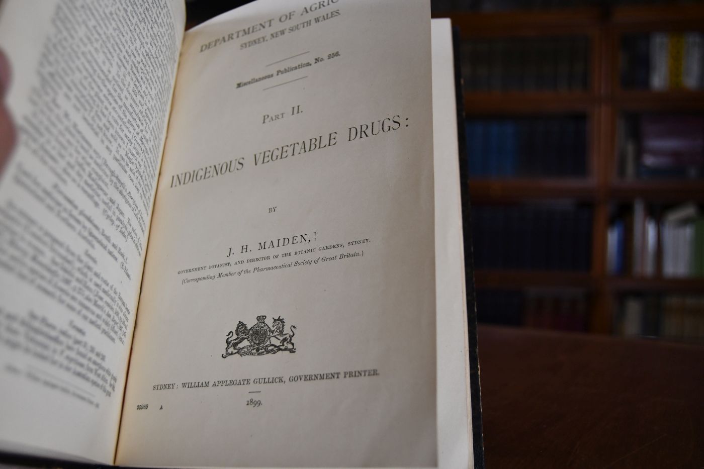Some new South Wales plants worth cultivating for Shade, Ornamental, and other purposes. Beigebunden 1. Joseph Henry Maiden Plants reputed to be poisonous to stock in Australia, 1897, Sydney, Gullick, 22 S. 2. Joseph Henry Maiden A Preliminary study of the Prickly-pears naturalised in New South Wales, Sydney, Gullick, 1898, 30 S., 3. Joseph Henry Maiden Indigenous vegetable drugs, Sydney, Gullick, 1898, 22 S., 4. Joseph Henry Maiden Indigenous vegetable drugs Part II, Sydney, Gullick, 1899, 24 S.