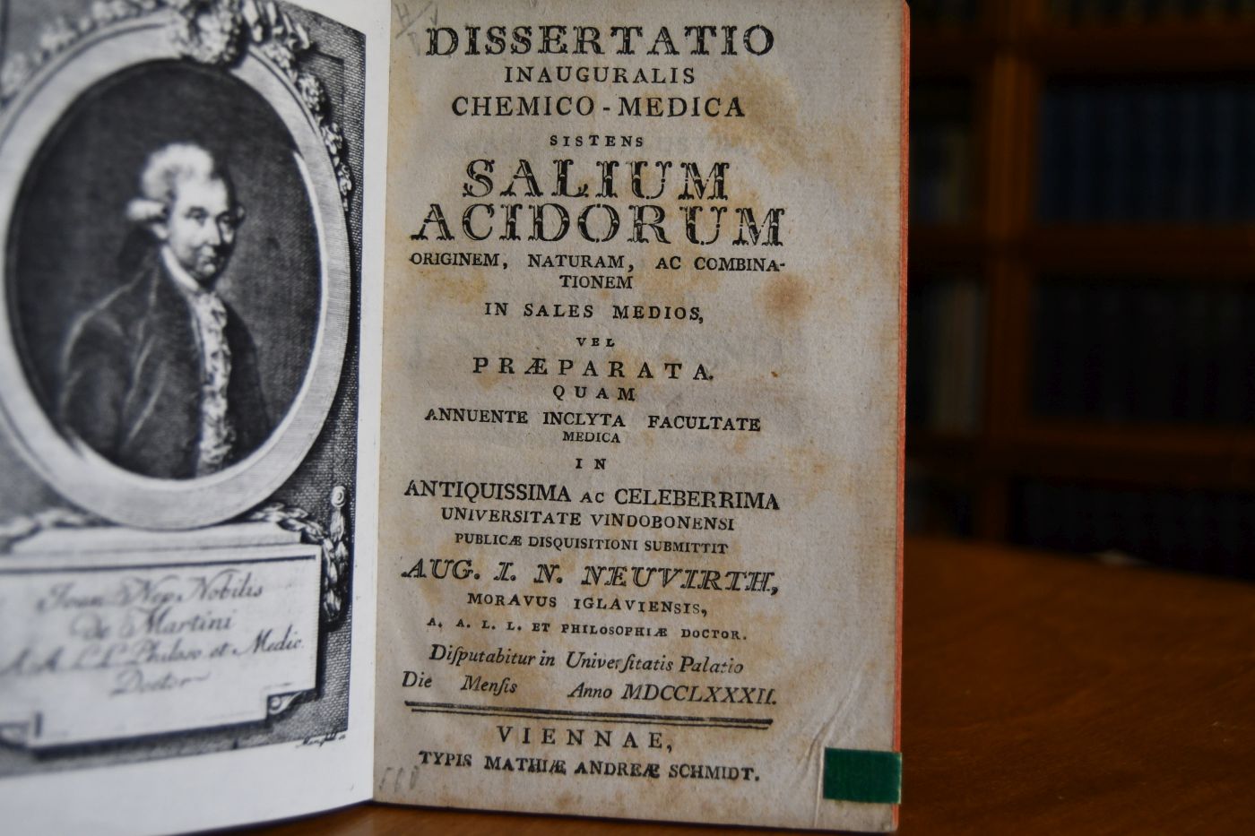 Dissertatio inauguralis chemico-medica sistens salium acidorum originem naturam, ac combinationem in sales medios vel praeparata quam annuente inclyta Facultate medica in Antiquissima ac Celeberima Universitate Vindobonensi publicae disquisitioni submittit Aug. I.N. Neuviert Moravus Iglauiensis, A. A. L. L. et Philosophiae Doctor. Disputabitur in Universitatis Palatio Die Mensis Anno MDCCLXXXII.
