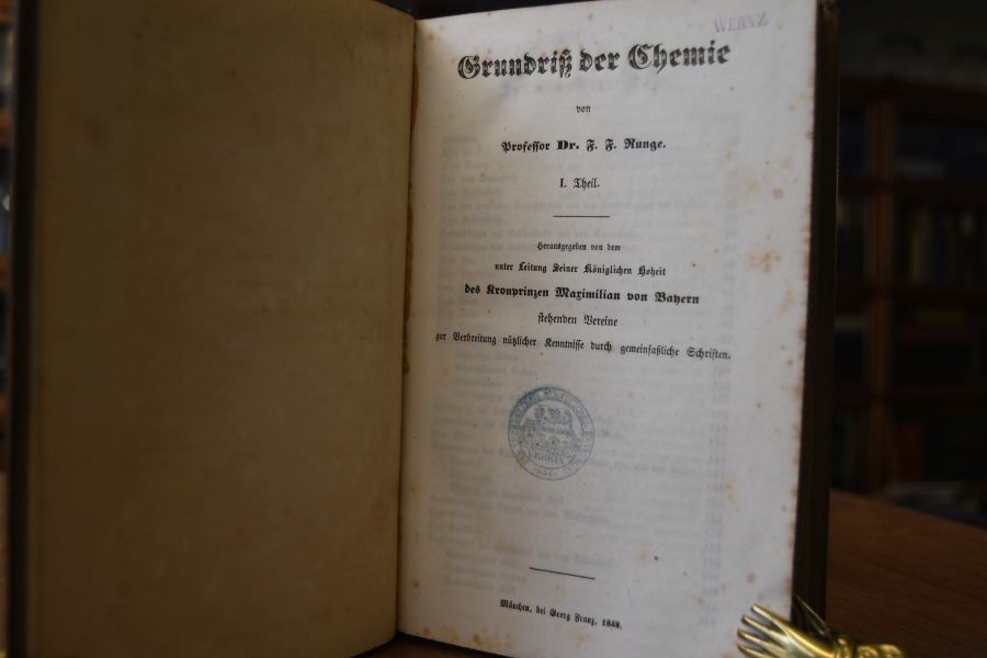 Beschreibung Einband berieben, bestoßen und fleckig. Besitzerstempel auf Titel. Innen durchgehend fleckig. Gutes Leseexemplar. "Friedlieb Ferdinand Runge (* 8. Februar 1794 in Hamburg-Billwerder; † 25. März 1867 in Oranienburg) war ein deutscher Chemiker. Runge wurde als drittes Kind des Pastors Johann Gerhardt Runge geboren. Runge konnte aus finanziellen Gründen zunächst nur die Elementarschule besuchen und war von 1810 bis 1816 Apothekerlehrling in der Ratsapotheke und der Löwen-Apotheke in Lübeck. Er studierte von 1816 bis 1822 an den Universitäten Berlin, Göttingen und Jena zuerst Medizin, dann an der Universität Jena Chemie. Er promovierte 1819 zum Dr. med. und 1822 in Berlin zum Doktor der Philosophie mit einer Arbeit über das wirtschaftlich bedeutende Indigo. 1826 wurde Runge Privatdozent und 1828 außerordentlicher Professor für Technologie an der Universität Breslau. 1832 beendete er seine Universitätslaufbahn und zog nach Oranienburg, wo er bis zu seinem Tode lebte, um im Chemischen Etablissement Dr. Hempel, später Chemische Produkten-Fabrik Oranienburg, als Industriechemiker zu arbeiten. Runge war schon zu seiner Zeit bekannt für seine Arbeiten zur technischen Auswertung des Steinkohlenteers, der damals in großen Mengen bei der Leuchtgas- und Koksherstellung aus Steinkohle als Abfall anfiel und oft ins Meer verklappt wurde, was zu einem ernsten ökologischen Problem zu werden drohte. Er isolierte, charakterisierte und benannte Substanzen aus dem Steinkohlenteer, die wichtigsten darunter Kyanol (Anilin), Pyrrol, Leukol (Chinolin), Carbolsäure (Phenol), Rosolsäure (Aurin) – Grundbausteine für chemische Stoffe der späteren, 1865 gegründeten Badischen Anilin- und Soda-Fabrik (BASF). Erst 1843 wurden jedoch von August Wilhelm von Hofmann eine Elementaranalyse und genauere Untersuchungen von Kyanol und Leukol durchgeführt, Auguste Laurent analysierte die elementare Zusammensetzung von Carbolsäure. Die stoffliche Identität des Kyanols war identisch mit dem Produkt aus Erhitzung der Anthranilsäure, dem Anilin, nach Fritzsche. Runge führte unterschiedliche Versuche mit Anilin durch. Mit Chlorkalklösung versetzt nahm dieses eine violette Farbe an. Diese Reaktion wird heute noch als Rungesche Chlorkalkreaktion zum Nachweis von Anilin verwendet. Mit Sauerstoff, Säuren oder Basen versetzt bildete Anilin rote Farbstoffe. Hiermit hatte Runge erstmals Teerfarbstoffe hergestellt, die damals aber noch keine wirtschaftliches Bedeutung hatten. Das schlagende Quecksilberherz in der heute bekannten Form wurde zuerst von Runge im Jahr 1829 beschrieben. Andere wichtige Substanzen, die er erstmals beschrieb, sind Thymol und die Alkaloide Hyoscyamin und Koffein (auf Anraten von Johann Wolfgang von Goethe, der in Kaffeebohnen ein Gegengift zu Atropin vermutete). Die Urform der Papierchromatographie wurde von ihm entdeckt. In Schulen werden im Chemieunterricht „Bilder, die sich selber malen“ hergestellt, die auf seinen Erkenntnissen beruhen. Diese auch „Runge-Bilder“ genannten Musterbilder gelten als Vorläufer der Papierchromatographie. Populär wurde Runges Arbeit durch Anilin, einen 1936 erschienenen biographischen Roman des nationalsozialistischen Autors Karl Aloys Schenzinger, der während der Zeit des Nationalsozialismus eine Auflage von 920.000 Exemplaren erreichte und auch noch in der Nachkriegszeit erfolgreich war. Seit 1994 gibt es den Friedlieb-Ferdinand-Runge-Preis für unkonventionelle Kunstvermittlung. " (Wikipedia)