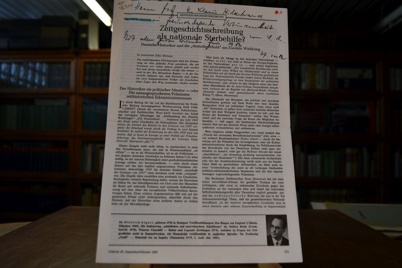 Beschreibung Berieben, bestoßen, fleckig und mit Querfalz. Handschriftliche Widmung von Dietrich Aigner an Klaus Hildebrand auf der Vorderseite.