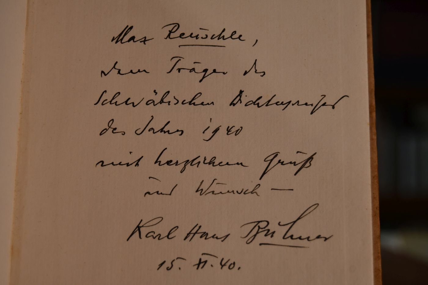 Beschreibung Schutzumschlag berieben, bestoßen, mit Einrissen, fleckig und feuchtigkeitsrandig. Schnitt fleckig. Mit handschriftlicher Widmung von Kárl Hans Bühner an Max Reuschle, einem anderen Mitglied des Schwäbischen Dichterkreises.