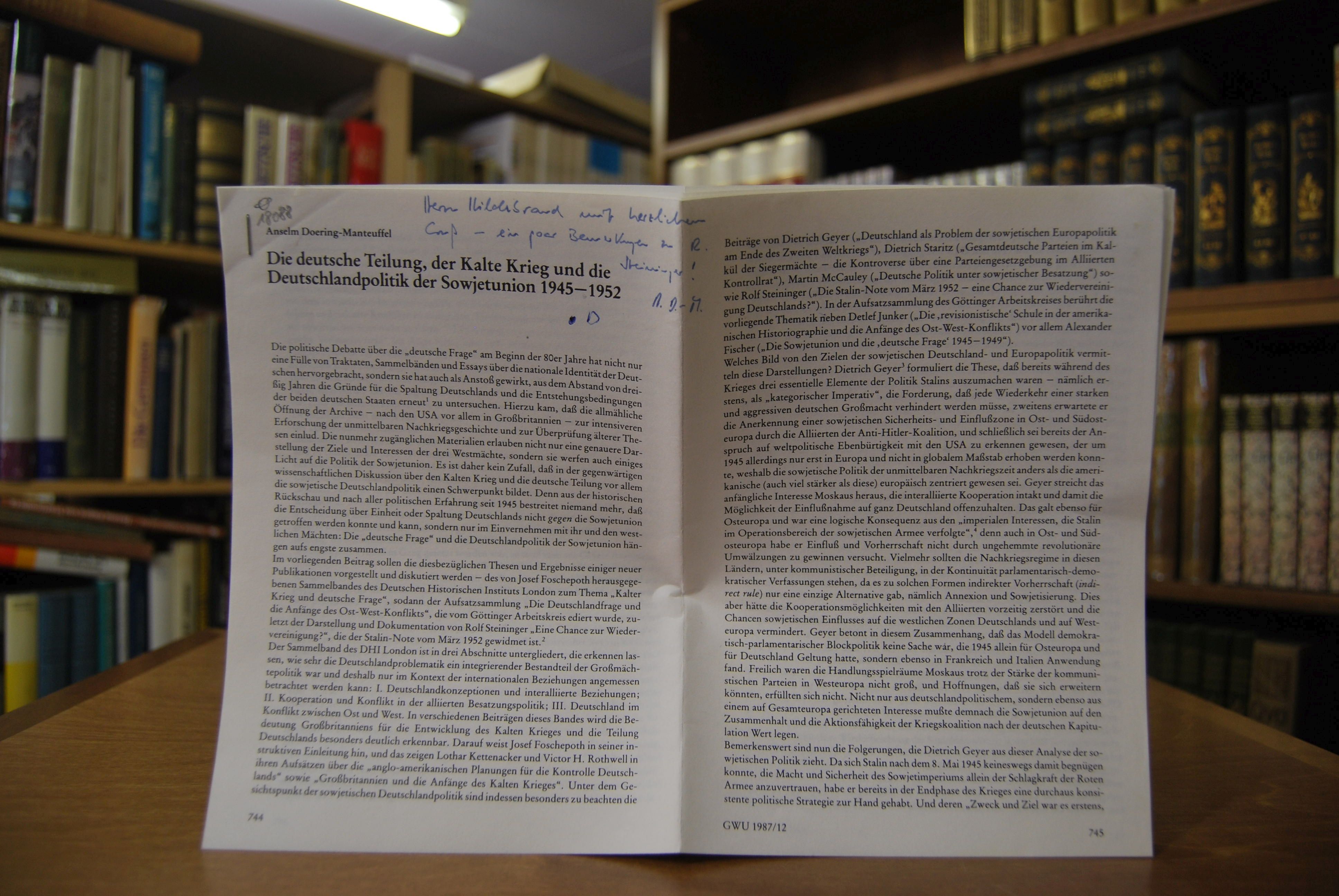 Beschreibung Mit handschriftlicher Widmung von Anselm Doering-Manteuffel auf dem Titel. "Anselm Doering-Manteuffel (* 19. Januar 1949 in Krefeld) ist ein deutscher Historiker und Direktor des Seminars für Zeitgeschichte der Eberhard Karls Universität Tübingen. Doering-Manteuffel studierte ab 1969 an der Universität Marburg, wo er 1975 das Staatsexamen ablegte, und an der FU Berlin. Von 1978 bis 1983 war er als wissenschaftlicher Assistent am Friedrich-Meinecke-Institut der FU Berlin bei Ernst Nolte tätig, wo er 1980 zum Thema Die Haltung des westdeutschen Katholizismus zur Wehrfrage 1948–1955 promoviert wurde. 1986 habilitierte er sich an der Friedrich-Alexander-Universität Erlangen-Nürnberg bei Michael Stürmer zum Thema England, die deutsche Frage und das europäische Mächtesystem 1815–1856. Seit 1991 ist er als Professor für Neuere Geschichte unter besonderer Berücksichtigung der Zeitgeschichte in Tübingen tätig. Anselm Doering-Manteuffel ist verheiratet mit der Ethnologin Sabine Doering-Manteuffel." (Wikipedia)