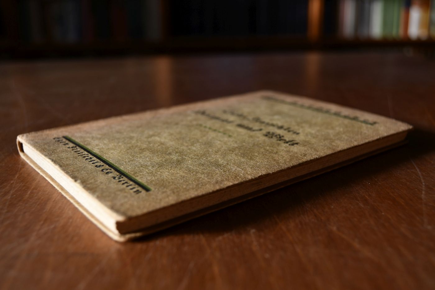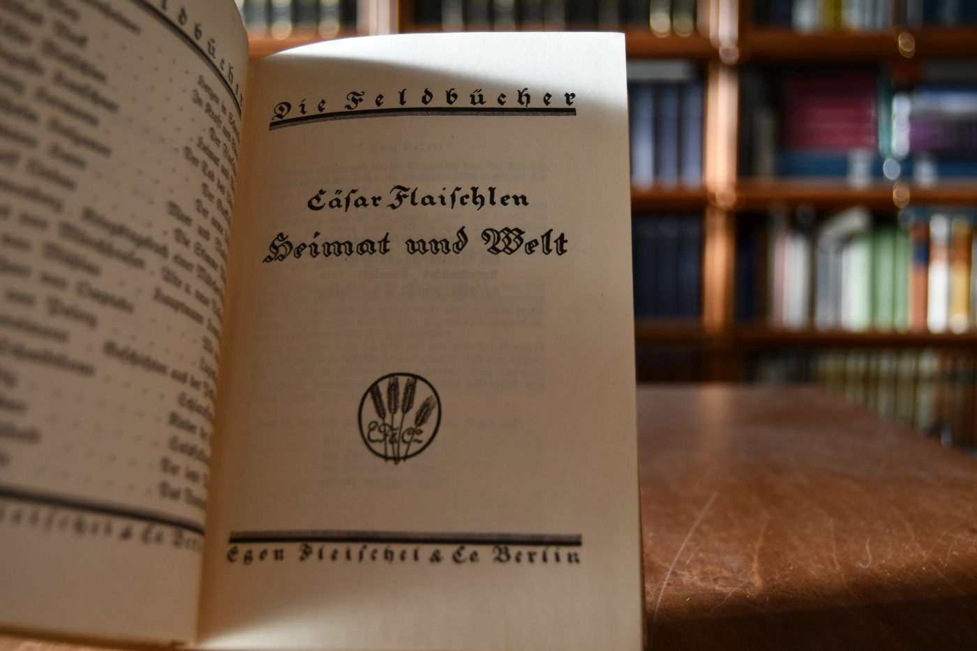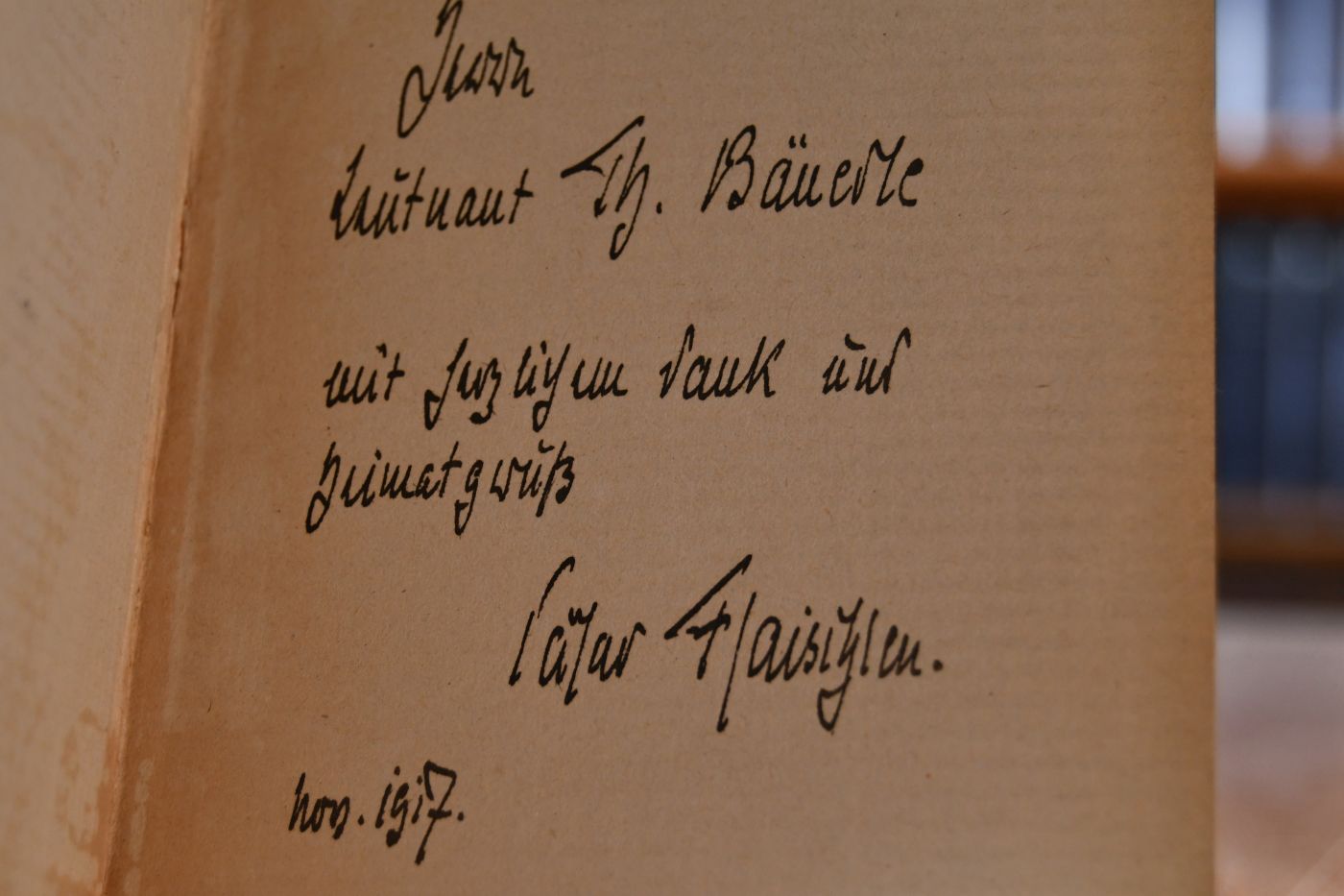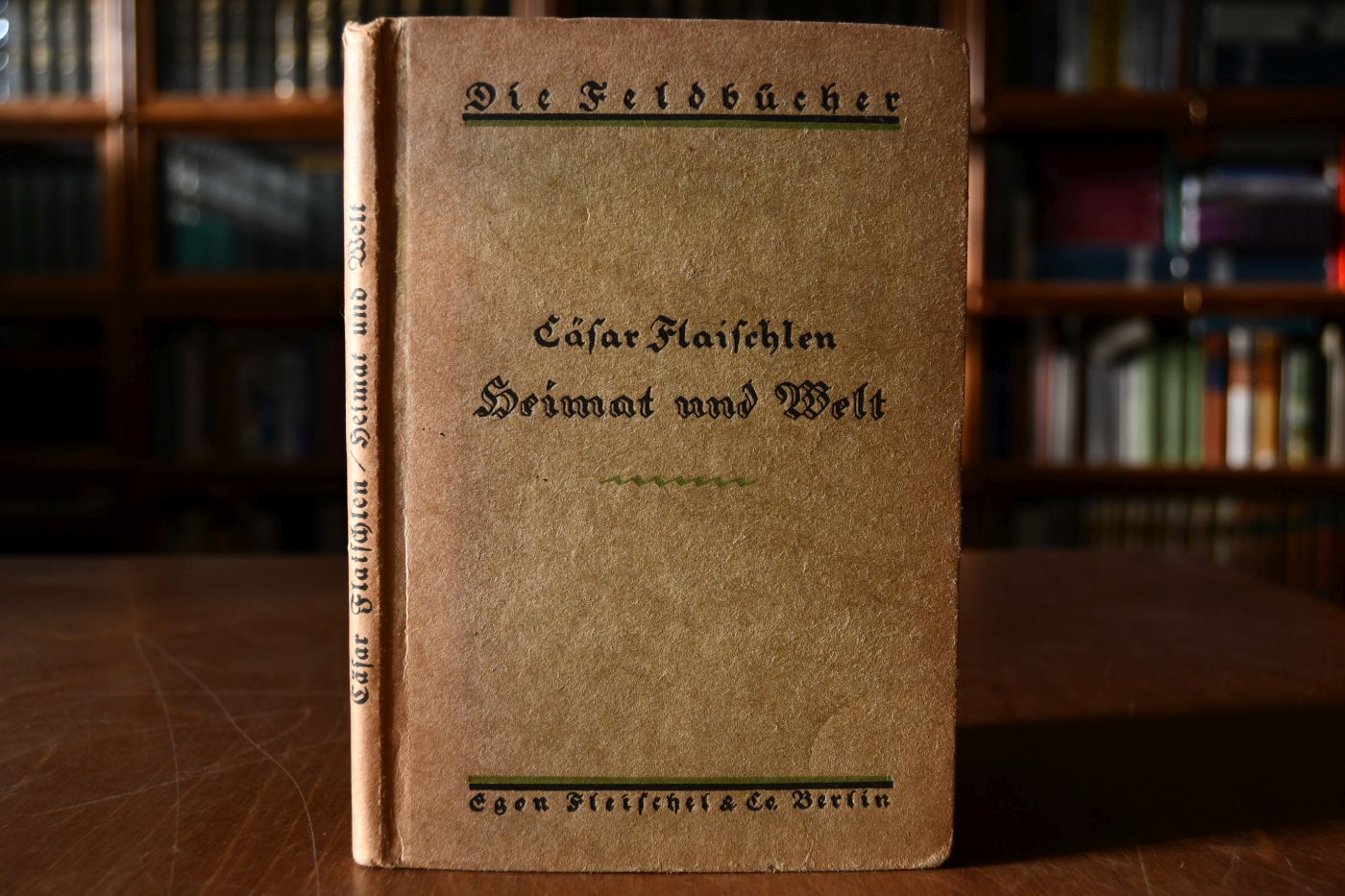 Beschreibung Einband berieben, bestoßen und gebräunt. Schnitt fleckig. Mit datierter handschriftlicher Widmung von Cäsar Flaischlen an Leutnant Th. Bäuerle auf dem fliegenden Vorsatz.