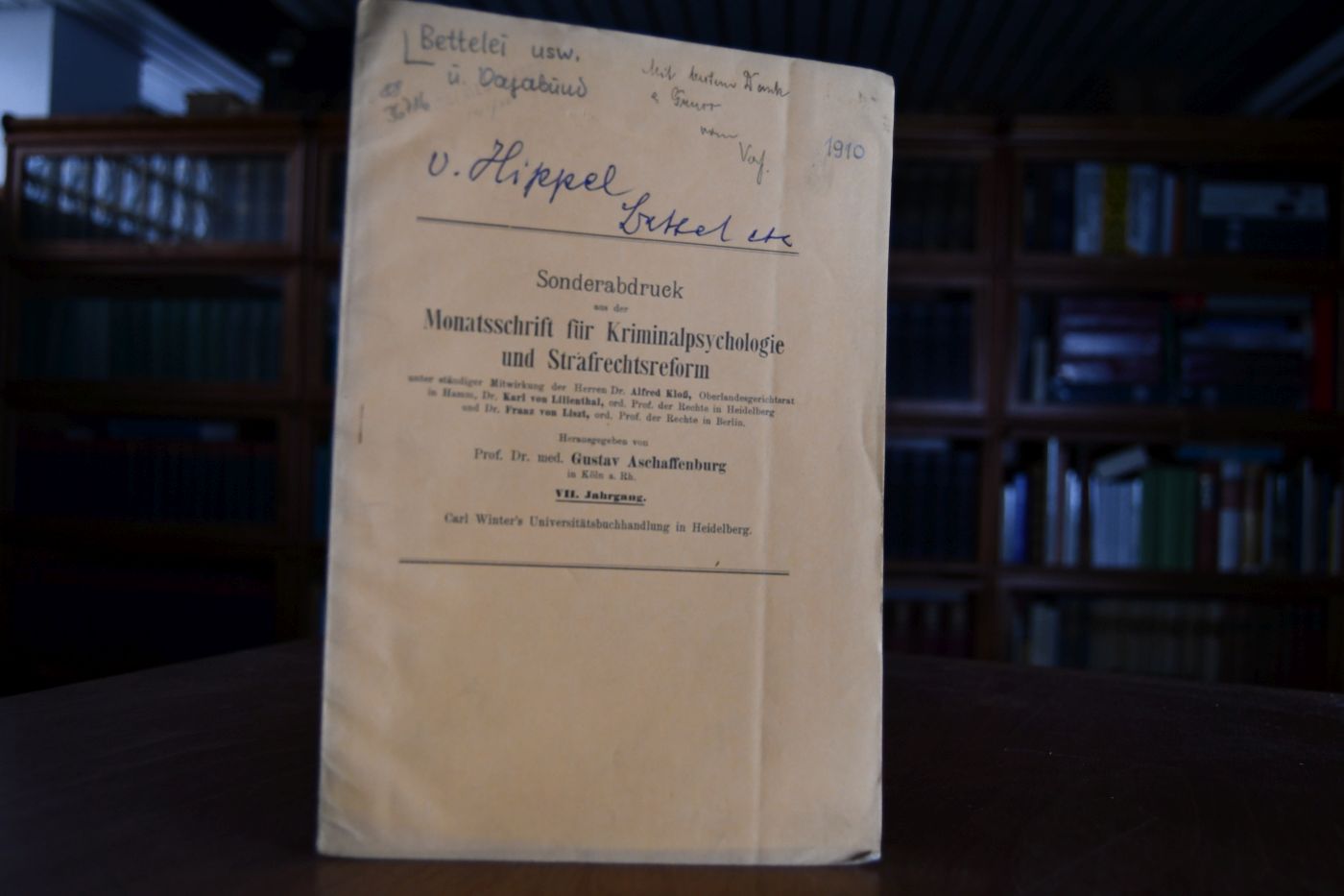 Beschreibung Einband berieben, bestoßen, angeschmutzt und mit handschriftlichem Titel auf Vorderdeckel. Eselsohrig. Innen sauber. Mit handschriftlicher Widmung von Robert von Hippel auf dem Vorderdeckel. Robert Wilhelm Ferdinand von Hippel (* 8. Juli 1866 in Königsberg (Preußen); † 16. Juni 1951 in Göttingen) war ein deutscher Jurist und Hochschullehrer.
