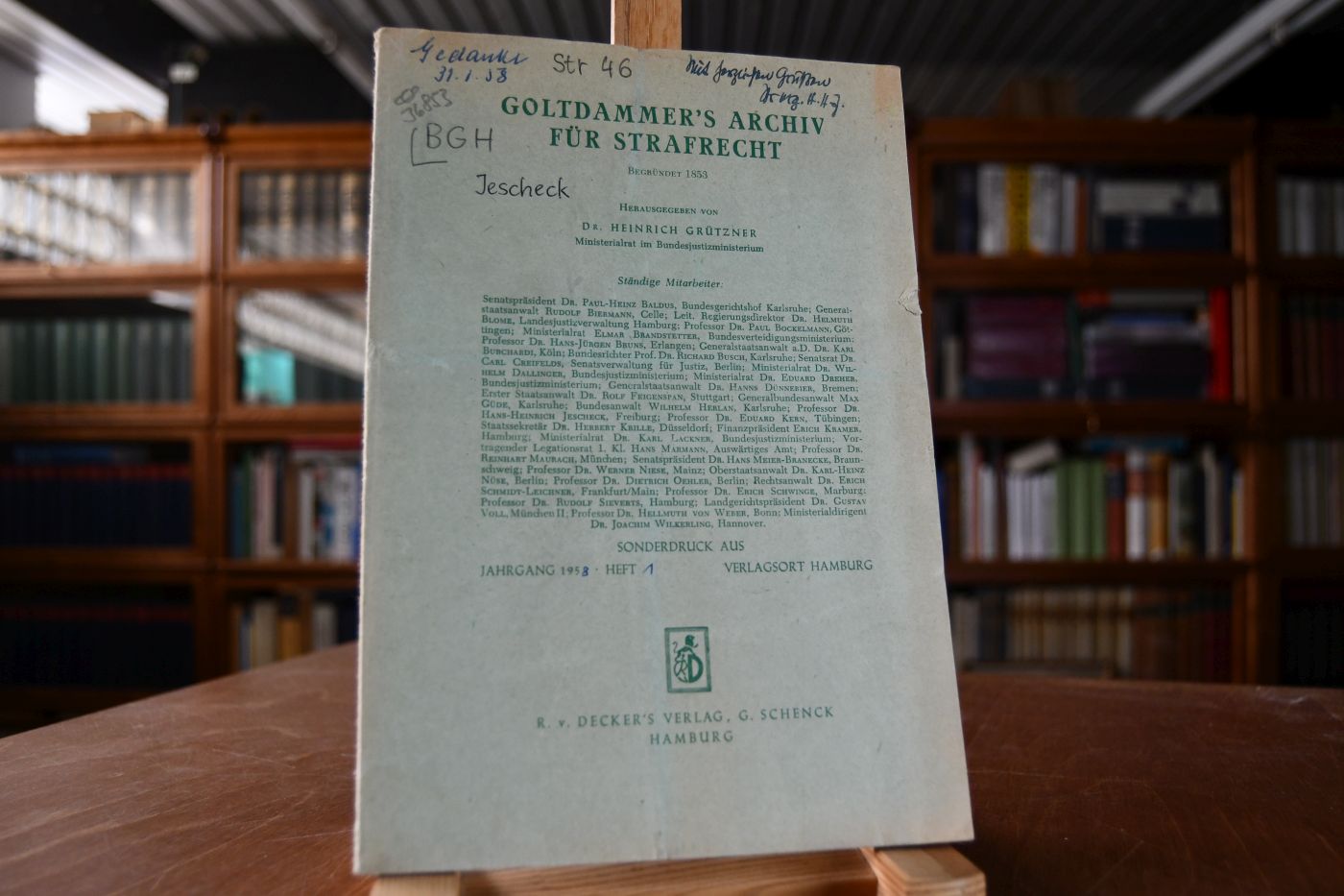 Beschreibung Einband berieben, bestoßen, gebräunt und mit Einrissen. Mit handschriftlichen Notizen und einer handschriftlichen Widmung von Hans-Heinrich Jescheck auf dem Vorderdeckel. Mit Randeinrissen.