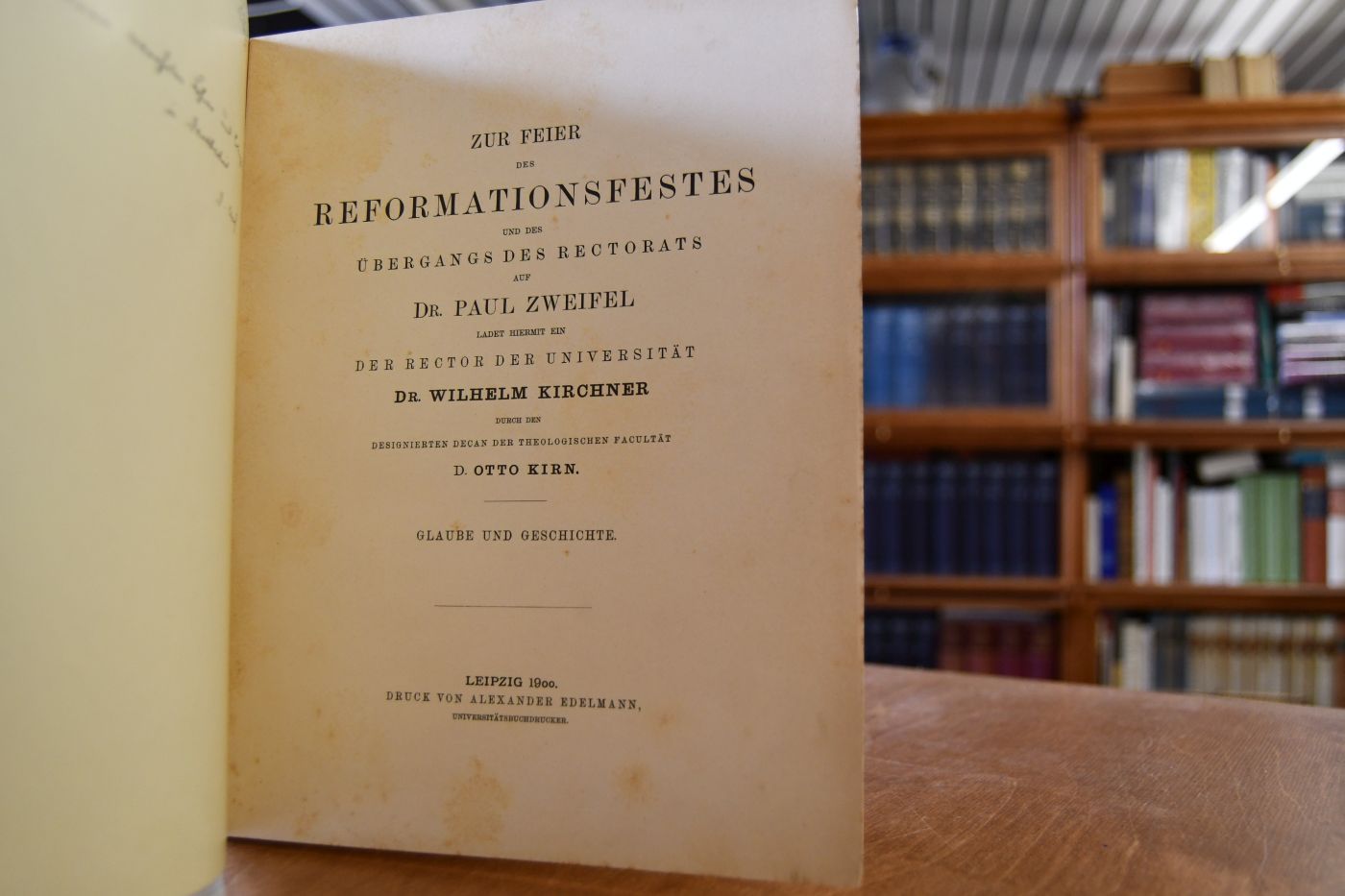 Glaube und Geschichte. Zur Feier des Reformationsfestes und des Übergangs des Rectorats auf Dr. Paul Zweifel ladet hiermit der Rector der Universität Dr. Wilhelm Kirchner durch den designierten Decan der theologischen Facultät D. Otto Kirn.