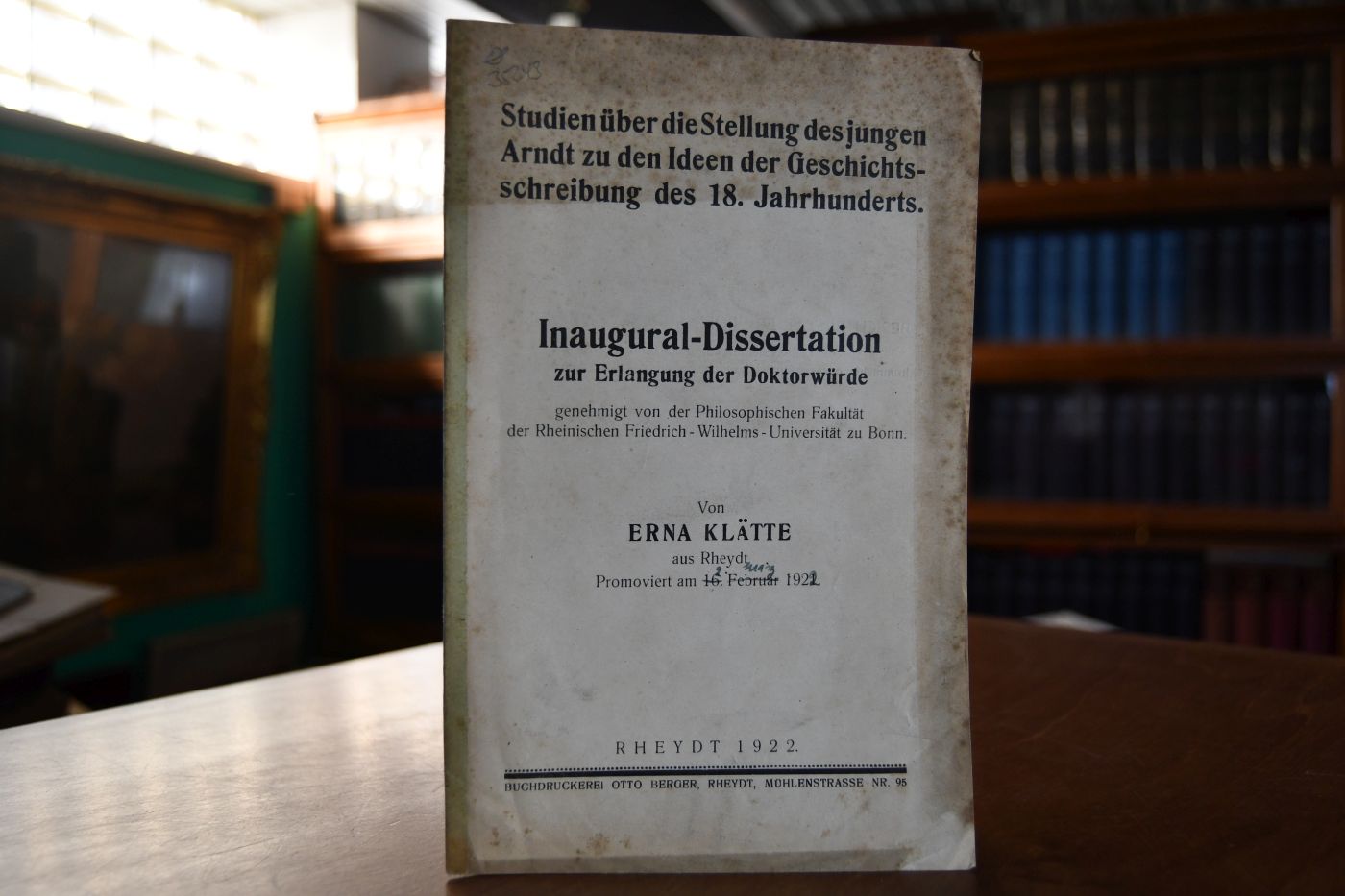Beschreibung Einband stärker fleckig und angeschmutzt. Eselsohrig. Mit handschriftlich korrigiertem Promotionsdatum auf Vorderdeckel und der handschriftlichen Adressangabe von Erna Klätte unter ihrem Lebenslauf.