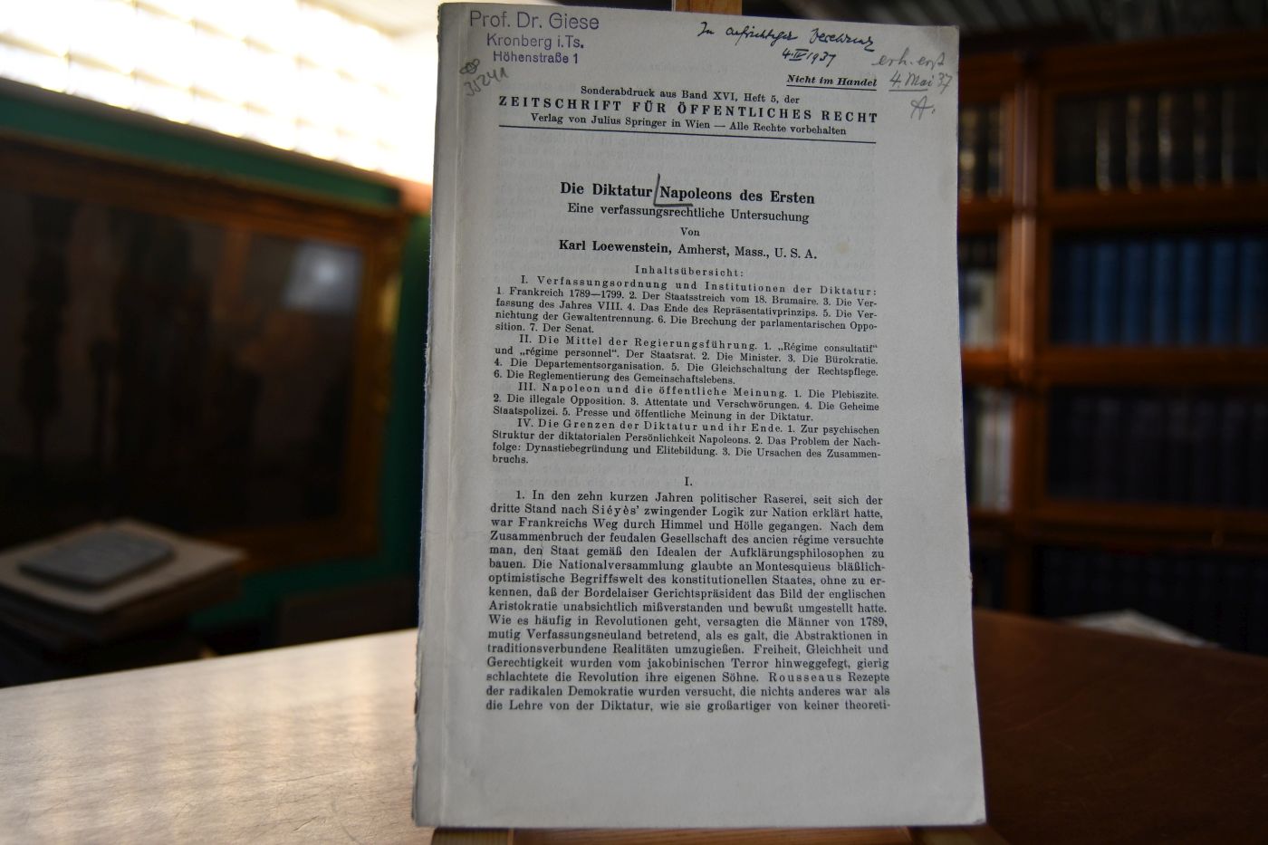 Beschreibung Einband berieben, bestoßen und mit Einrissen am Rücken. Besitzerstempel (Prof. Dr. Giese) auf dem Vorderdeckel. Durchgehend mit Bleistiftanstreichungen und -marginalien. Handschriftliche Widmung von Karl Loewenstein auf Vorderdeckel.