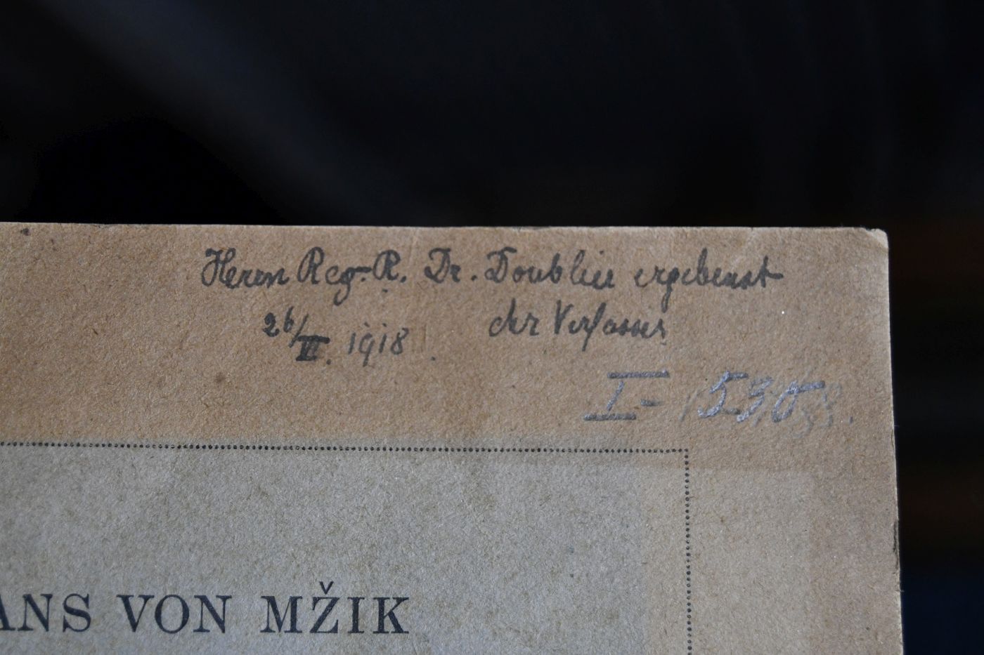Beschreibung Einband berieben, bestoßen, gebräunt und mit Einrissen. Handschriftliche Widmung von Hans von Mzik auf dem Vorderdeckel. Eselsohrig und mit Randeinrissen.
