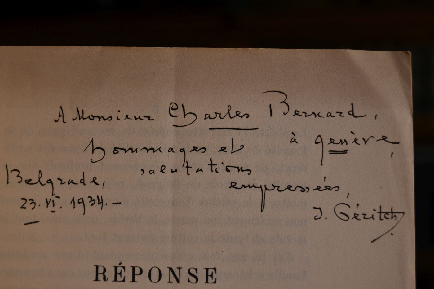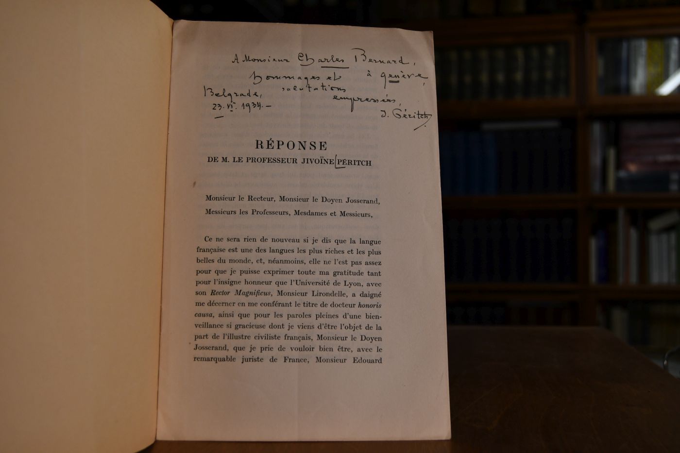 Reponse de M. Le Professeur Jivoine Peritch.